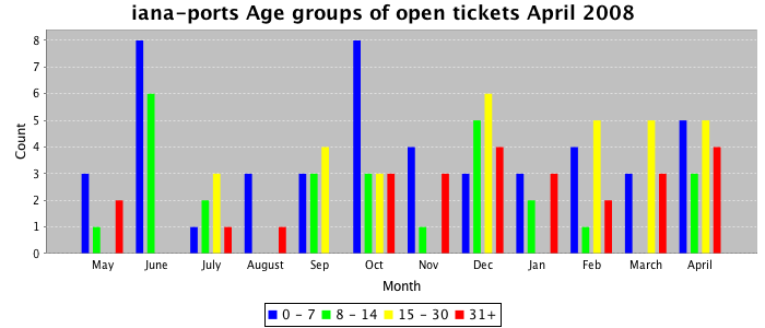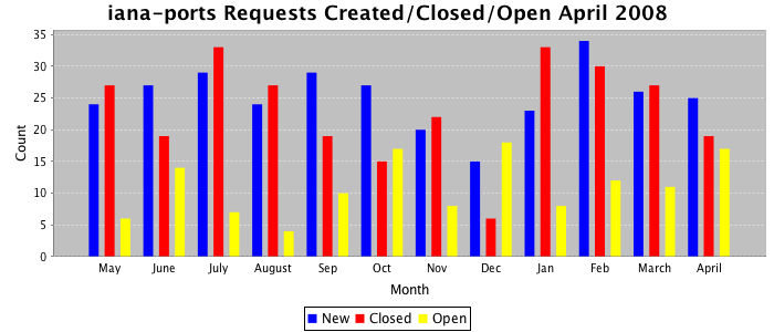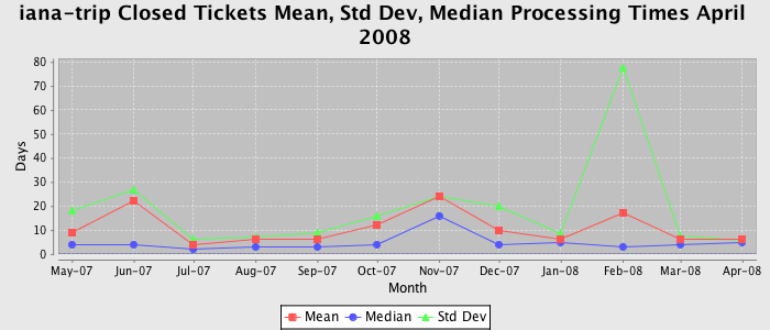 April 2008Due to the nature of resource request reviews, ICANN/IANA and the IETF community are jointly responsible for cooperatively managing the resource request process. ICANN/IANA has control over the functions it performs directly, e.g., receiving requests, making sure they are syntactically and semantically sensible, forwarding the requests to Designated Experts where appropriate, creating and modifying the registries, etc. The IETF community has direct or indirect control over functions performed by third parties, including IESG Designated Experts, the IESG, the IAB, the RFC Editor, and the requester. As such, the processing of requests has a “gross processing time” calendar days goal established for each function and a “net processing time” calendar days goal to reflect time expended directly by ICANN/IANA.