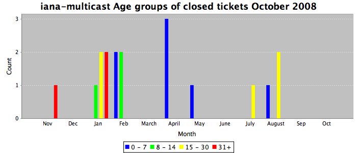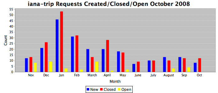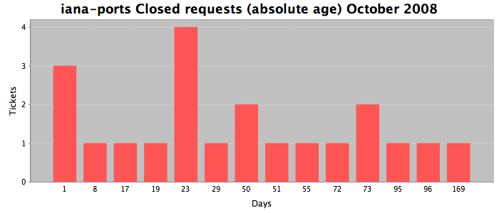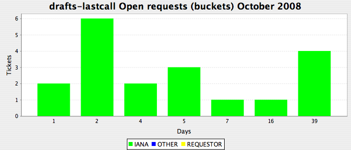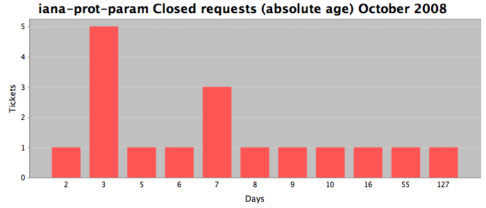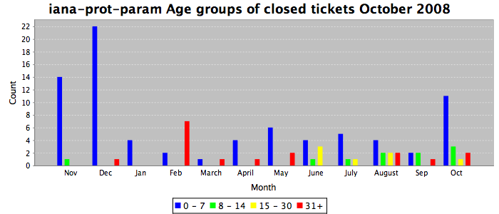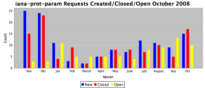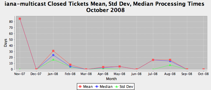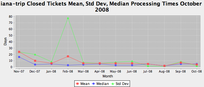 October 2008Due to the nature of resource request reviews, ICANN/IANA and the IETF community are jointly responsible for cooperatively managing the resource request process. ICANN/IANA has control over the functions it performs directly, e.g., receiving requests, making sure they are syntactically and semantically sensible, forwarding the requests to Designated Experts where appropriate, creating and modifying the registries, etc. The IETF community has direct or indirect control over functions performed by third parties, including IESG Designated Experts, the IESG, the IAB, the RFC Editor, and the requester. As such, the processing of requests has a “gross processing time” calendar days goal established for each function and a “net processing time” calendar days goal to reflect time expended directly by ICANN/IANA.