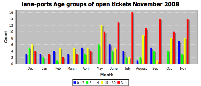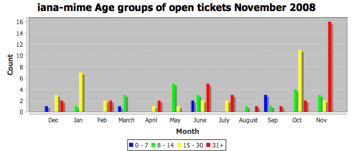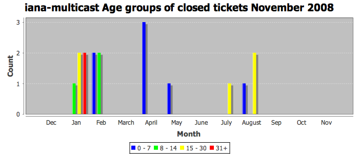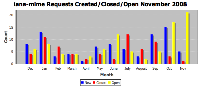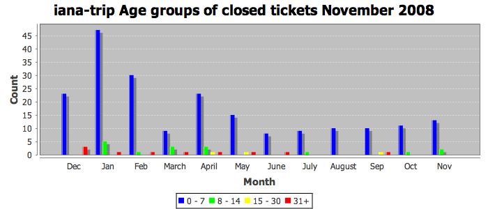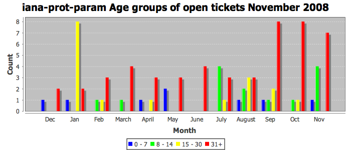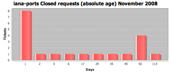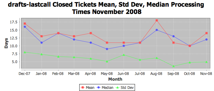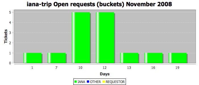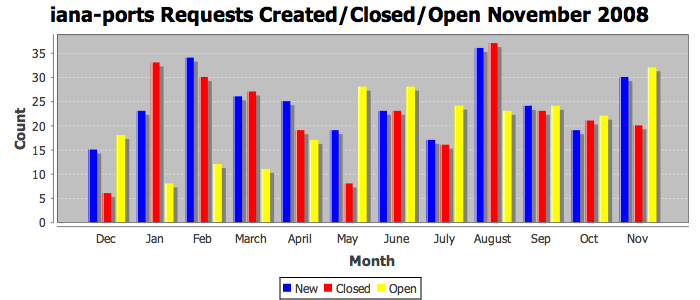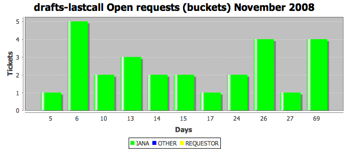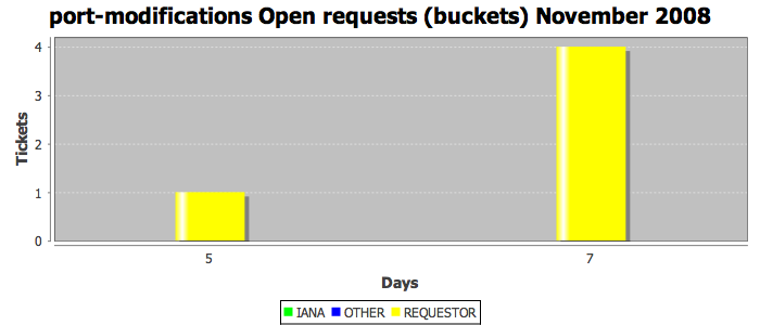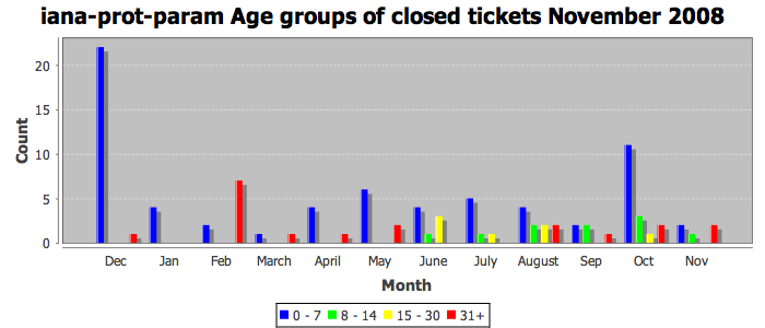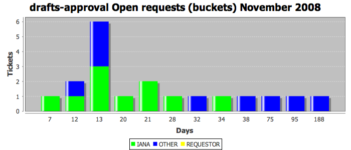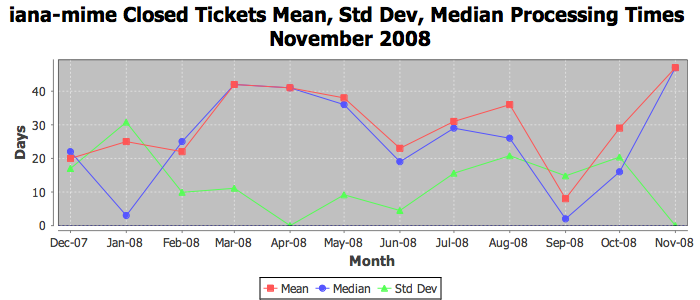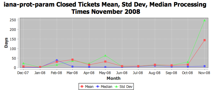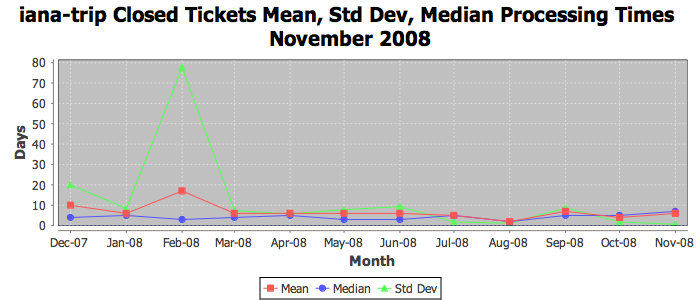 November 2008Due to the nature of resource request reviews, ICANN/IANA and the IETF community are jointly responsible for cooperatively managing the resource request process. ICANN/IANA has control over the functions it performs directly, e.g., receiving requests, making sure they are syntactically and semantically sensible, forwarding the requests to Designated Experts where appropriate, creating and modifying the registries, etc. The IETF community has direct or indirect control over functions performed by third parties, including IESG Designated Experts, the IESG, the IAB, the RFC Editor, and the requester. As such, the processing of requests has a “gross processing time” calendar days goal established for each function and a “net processing time” calendar days goal to reflect time expended directly by ICANN/IANA.