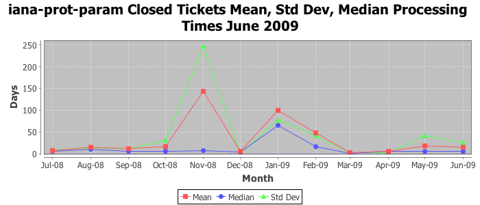 June 2009Due to the nature of resource request reviews, ICANN/IANA and the IETF community are jointly responsible for cooperatively managing the resource request process. ICANN/IANA has control over the functions it performs directly, e.g., receiving requests, making sure they are syntactically and semantically sensible, forwarding the requests to Designated Experts where appropriate, creating and modifying the registries, etc. The IETF community has direct or indirect control over functions performed by third parties, including IESG Designated Experts, the IESG, the IAB, the RFC Editor, and the requester. As such, the processing of requests has a “gross processing time” calendar days goal established for each function and a “net processing time” calendar days goal to reflect time expended directly by ICANN/IANA.