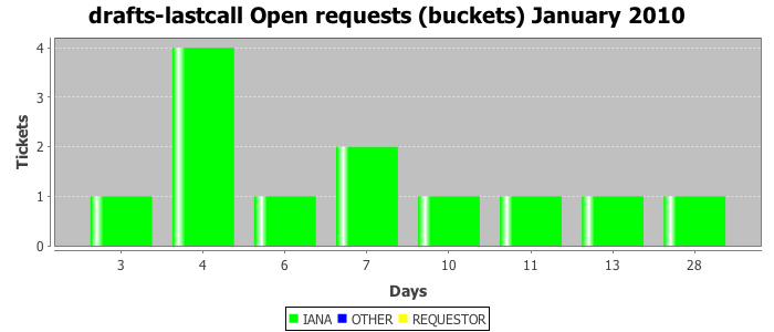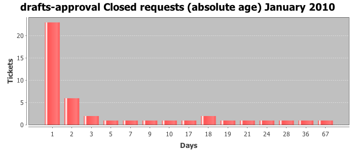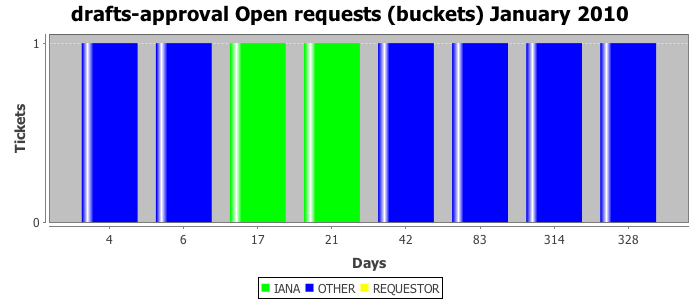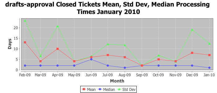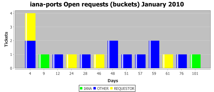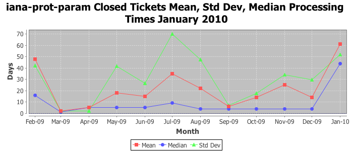 January 2010Due to the nature of resource request reviews, ICANN/IANA and the IETF community are jointly responsible for cooperatively managing the resource request process. ICANN/IANA has control over the functions it performs directly, e.g., receiving requests, making sure they are syntactically and semantically sensible, forwarding the requests to Designated Experts where appropriate, creating and modifying the registries, etc. The IETF community has direct or indirect control over functions performed by third parties, including IESG Designated Experts, the IESG, the IAB, the RFC Editor, and the requester. As such, the processing of requests has a “gross processing time” calendar days goal established for each function and a “net processing time” calendar days goal to reflect time expended directly by ICANN/IANA.