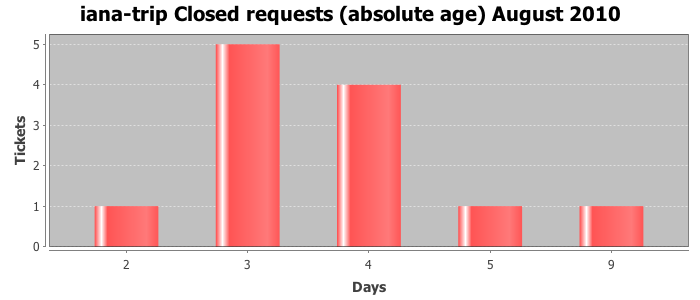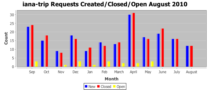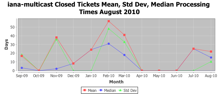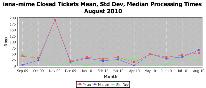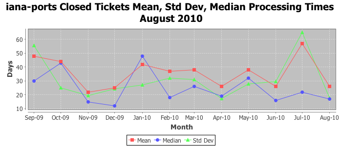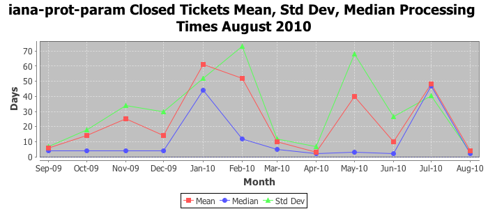 August 2010Due to the nature of resource request reviews, ICANN/IANA and the IETF community are jointly responsible for cooperatively managing the resource request process. ICANN/IANA has control over the functions it performs directly, e.g., receiving requests, making sure they are syntactically and semantically sensible, forwarding the requests to Designated Experts where appropriate, creating and modifying the registries, etc. The IETF community has direct or indirect control over functions performed by third parties, including IESG Designated Experts, the IESG, the IAB, the RFC Editor, and the requester. As such, the processing of requests has a “gross processing time” calendar days goal established for each function and a “net processing time” calendar days goal to reflect time expended directly by ICANN/IANA.