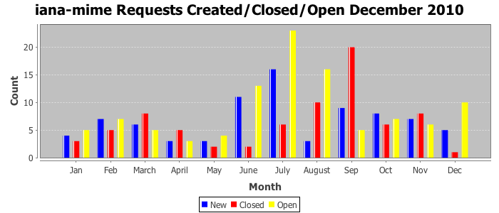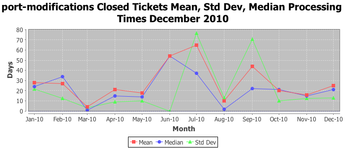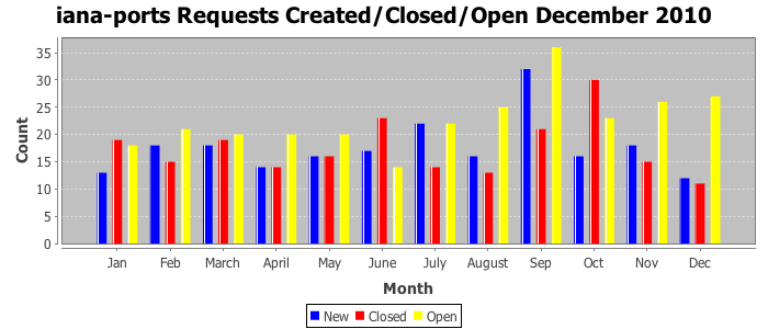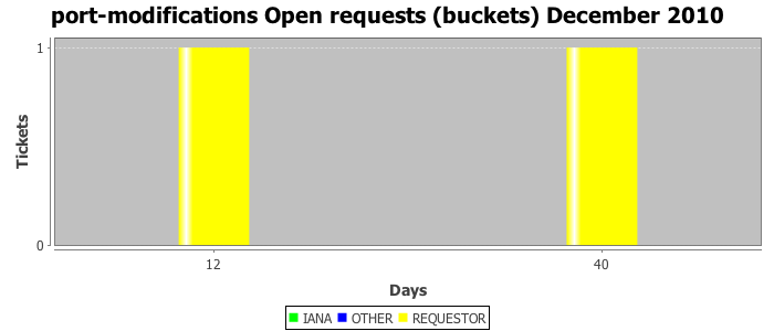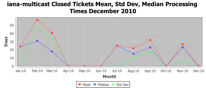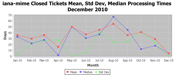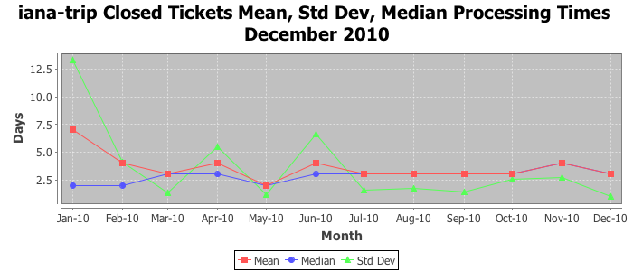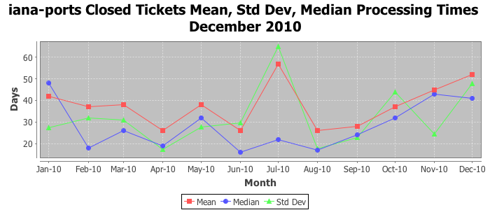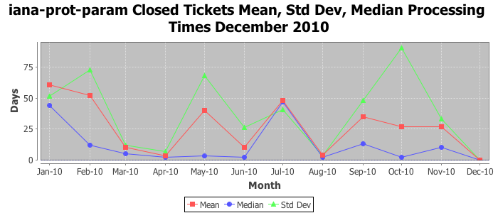 December 2010Due to the nature of resource request reviews, ICANN/IANA and the IETF community are jointly responsible for cooperatively managing the resource request process. ICANN/IANA has control over the functions it performs directly, e.g., receiving requests, making sure they are syntactically and semantically sensible, forwarding the requests to Designated Experts where appropriate, creating and modifying the registries, etc. The IETF community has direct or indirect control over functions performed by third parties, including IESG Designated Experts, the IESG, the IAB, the RFC Editor, and the requester. As such, the processing of requests has a “gross processing time” calendar days goal established for each function and a “net processing time” calendar days goal to reflect time expended directly by ICANN/IANA.