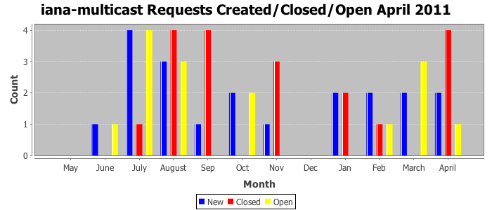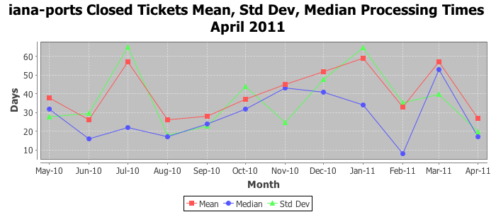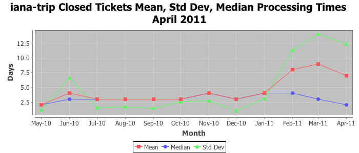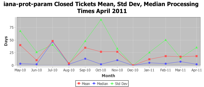 April 2011Due to the nature of resource request reviews, ICANN/IANA and the IETF community are jointly responsible for cooperatively managing the resource request process. ICANN/IANA has control over the functions it performs directly, e.g., receiving requests, making sure they are syntactically and semantically sensible, forwarding the requests to Designated Experts where appropriate, creating and modifying the registries, etc. The IETF community has direct or indirect control over functions performed by third parties, including IESG Designated Experts, the IESG, the IAB, the RFC Editor, and the requester. As such, the processing of requests has a “gross processing time” calendar days goal established for each function and a “net processing time” calendar days goal to reflect time expended directly by ICANN/IANA.