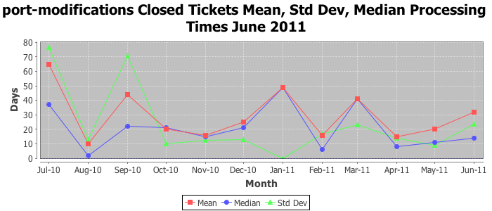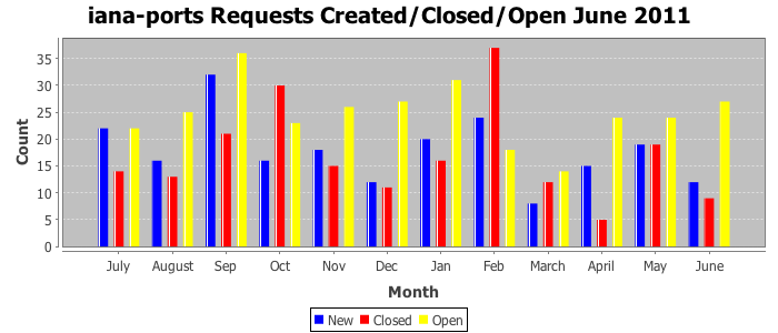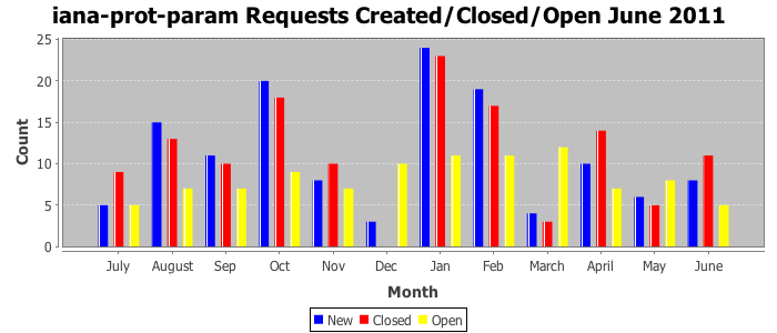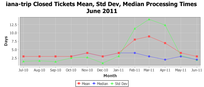 June 2011Due to the nature of resource request reviews, ICANN/IANA and the IETF community are jointly responsible for cooperatively managing the resource request process. ICANN/IANA has control over the functions it performs directly, e.g., receiving requests, making sure they are syntactically and semantically sensible, forwarding the requests to Designated Experts where appropriate, creating and modifying the registries, etc. The IETF community has direct or indirect control over functions performed by third parties, including IESG Designated Experts, the IESG, the IAB, the RFC Editor, and the requester. As such, the processing of requests has a “gross processing time” calendar days goal established for each function and a “net processing time” calendar days goal to reflect time expended directly by ICANN/IANA.