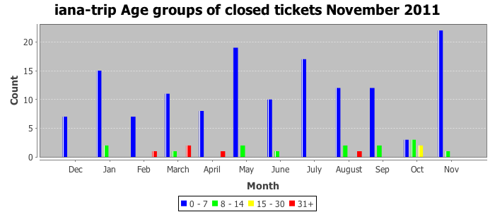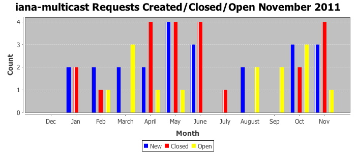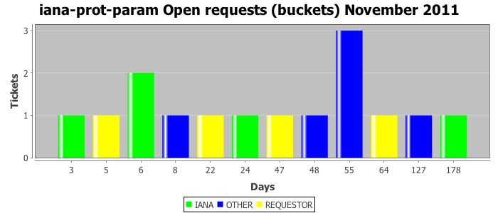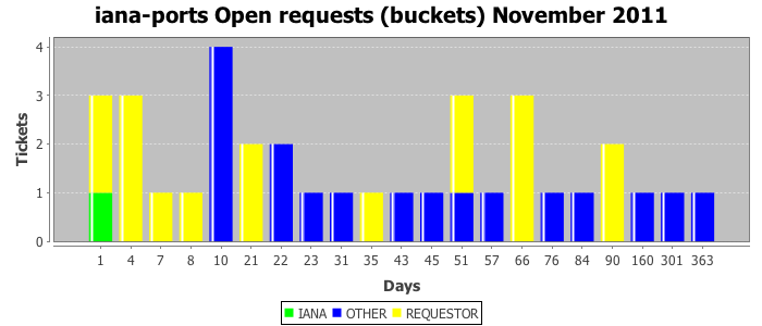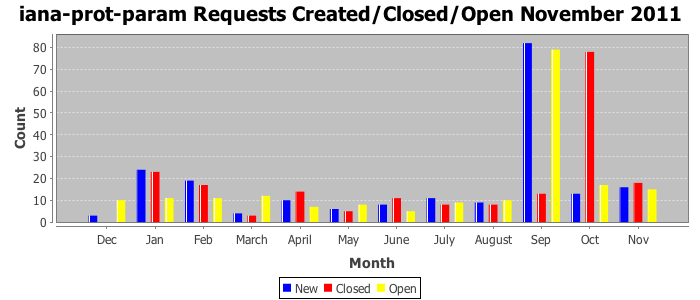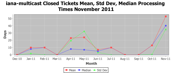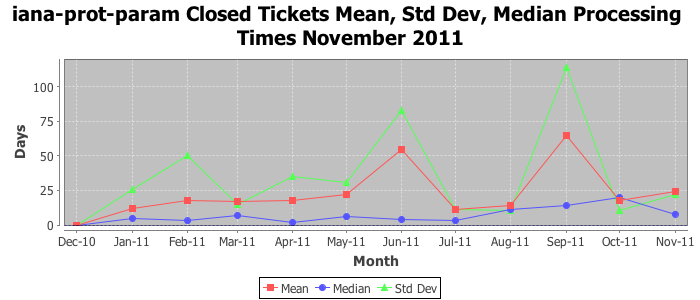 November 2011Due to the nature of resource request reviews, ICANN/IANA and the IETF community are jointly responsible for cooperatively managing the resource request process. ICANN/IANA has control over the functions it performs directly, e.g., receiving requests, making sure they are syntactically and semantically sensible, forwarding the requests to Designated Experts where appropriate, creating and modifying the registries, etc. The IETF community has direct or indirect control over functions performed by third parties, including IESG Designated Experts, the IESG, the IAB, the RFC Editor, and the requester. As such, the processing of requests has a “gross processing time” calendar days goal established for each function and a “net processing time” calendar days goal to reflect time expended directly by ICANN/IANA.