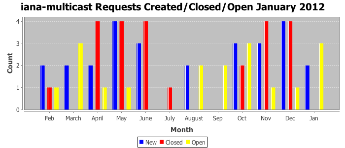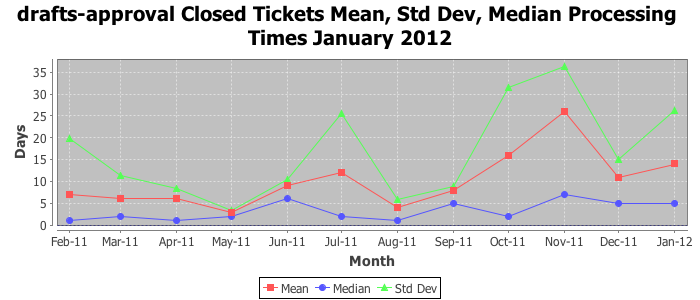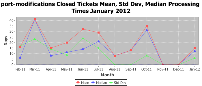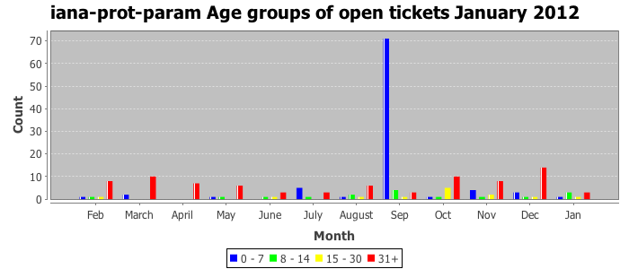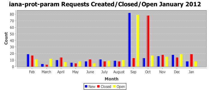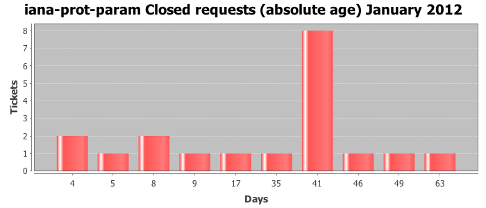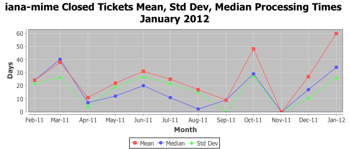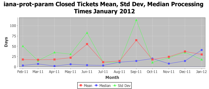 January 2012Due to the nature of resource request reviews, ICANN/IANA and the IETF community are jointly responsible for cooperatively managing the resource request process. ICANN/IANA has control over the functions it performs directly, e.g., receiving requests, making sure they are syntactically and semantically sensible, forwarding the requests to Designated Experts where appropriate, creating and modifying the registries, etc. The IETF community has direct or indirect control over functions performed by third parties, including IESG Designated Experts, the IESG, the IAB, the RFC Editor, and the requester. As such, the processing of requests has a “gross processing time” calendar days goal established for each function and a “net processing time” calendar days goal to reflect time expended directly by ICANN/IANA.