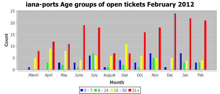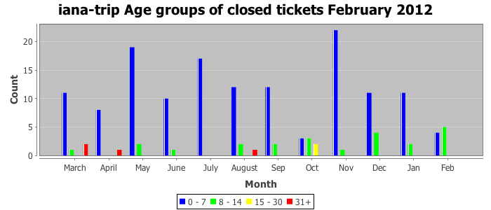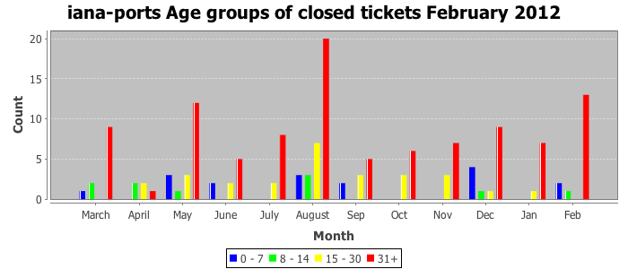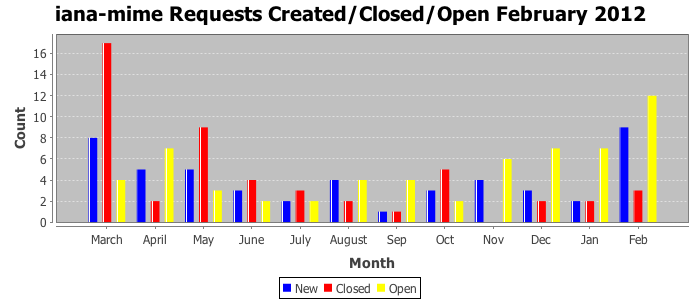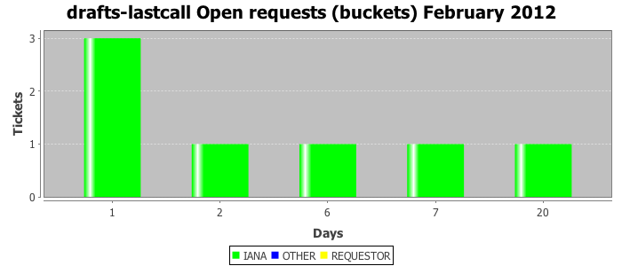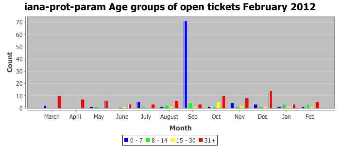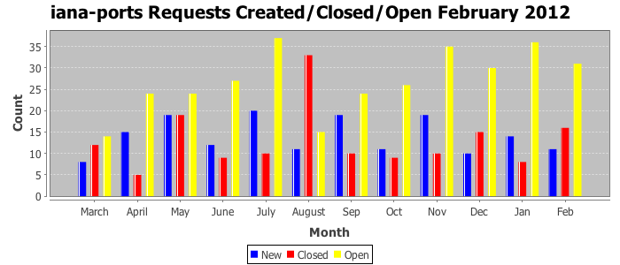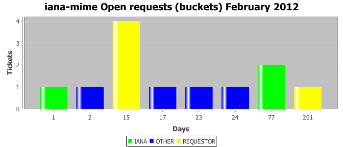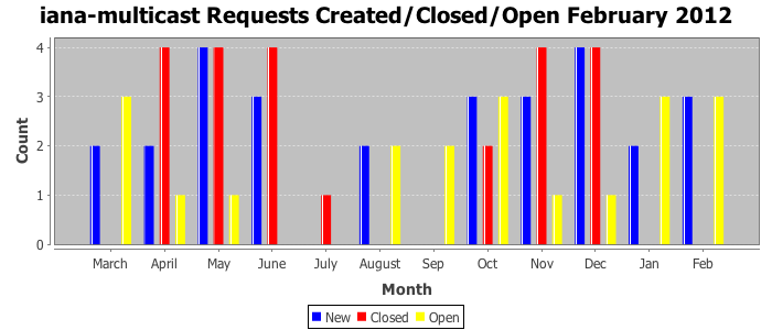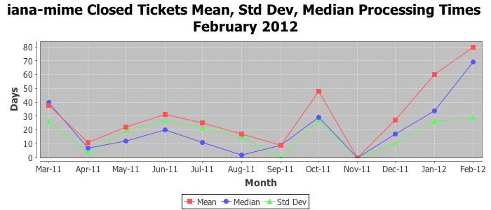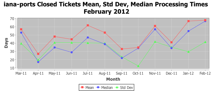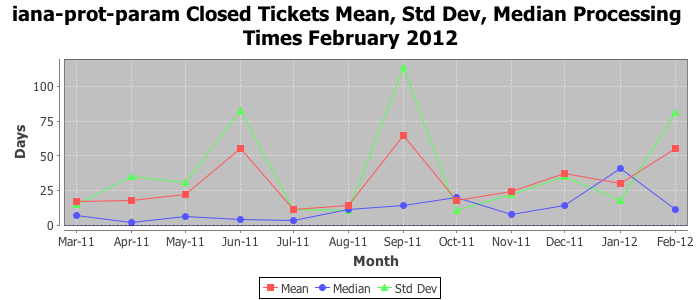 February 2012Due to the nature of resource request reviews, ICANN/IANA and the IETF community are jointly responsible for cooperatively managing the resource request process. ICANN/IANA has control over the functions it performs directly, e.g., receiving requests, making sure they are syntactically and semantically sensible, forwarding the requests to Designated Experts where appropriate, creating and modifying the registries, etc. The IETF community has direct or indirect control over functions performed by third parties, including IESG Designated Experts, the IESG, the IAB, the RFC Editor, and the requester. As such, the processing of requests has a “gross processing time” calendar days goal established for each function and a “net processing time” calendar days goal to reflect time expended directly by ICANN/IANA.