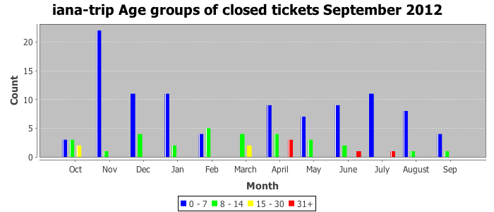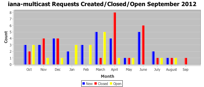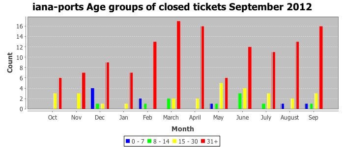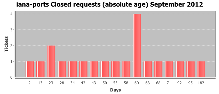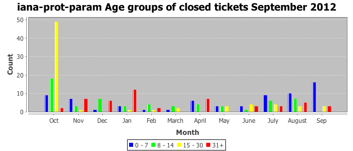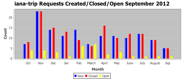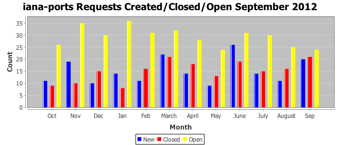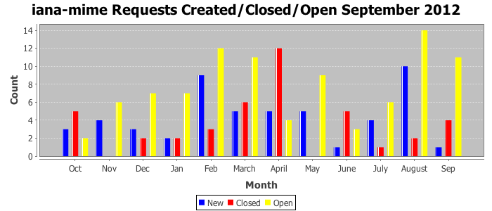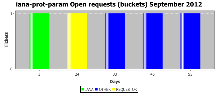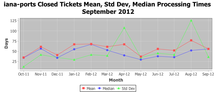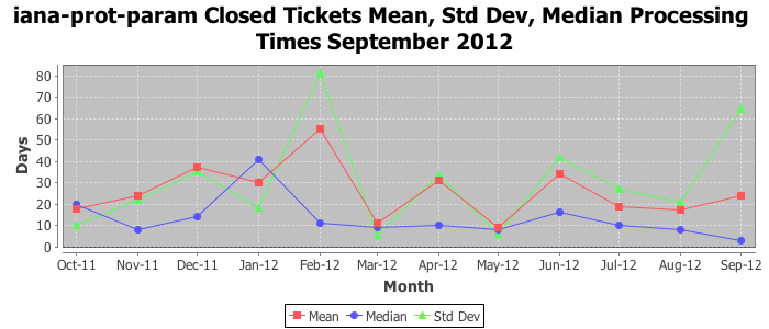 September 2012Due to the nature of resource request reviews, ICANN/IANA and the IETF community are jointly responsible for cooperatively managing the resource request process. ICANN/IANA has control over the functions it performs directly, e.g., receiving requests, making sure they are syntactically and semantically sensible, forwarding the requests to Designated Experts where appropriate, creating and modifying the registries, etc. The IETF community has direct or indirect control over functions performed by third parties, including IESG Designated Experts, the IESG, the IAB, the RFC Editor, and the requester. As such, the processing of requests has a “gross processing time” calendar days goal established for each function and a “net processing time” calendar days goal to reflect time expended directly by ICANN/IANA.