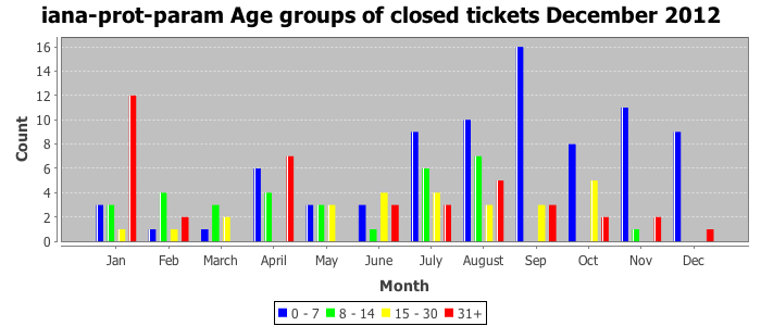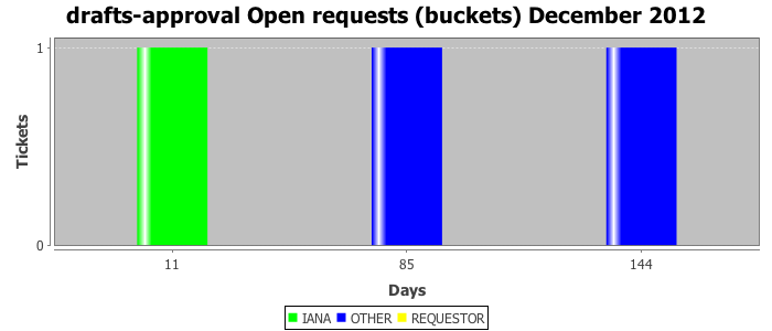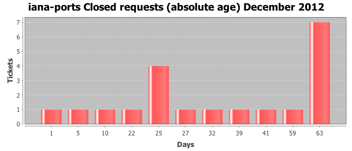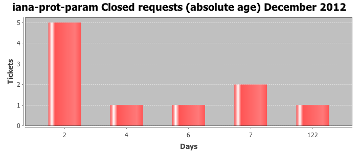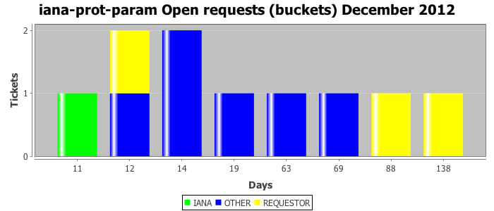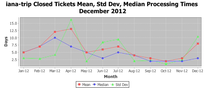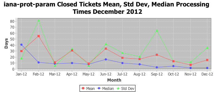 December 2012Due to the nature of resource request reviews, ICANN/IANA and the IETF community are jointly responsible for cooperatively managing the resource request process. ICANN/IANA has control over the functions it performs directly, e.g., receiving requests, making sure they are syntactically and semantically sensible, forwarding the requests to Designated Experts where appropriate, creating and modifying the registries, etc. The IETF community has direct or indirect control over functions performed by third parties, including IESG Designated Experts, the IESG, the IAB, the RFC Editor, and the requester. As such, the processing of requests has a “gross processing time” calendar days goal established for each function and a “net processing time” calendar days goal to reflect time expended directly by ICANN/IANA.