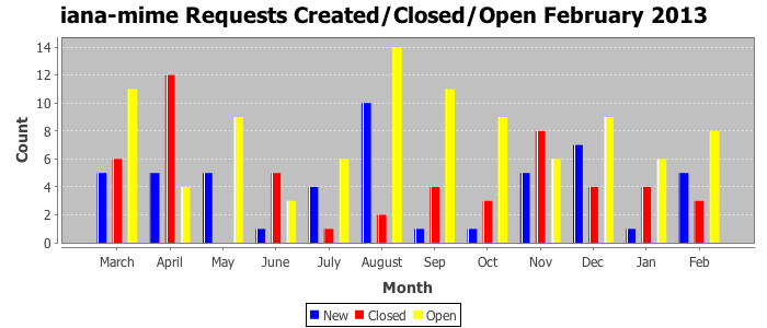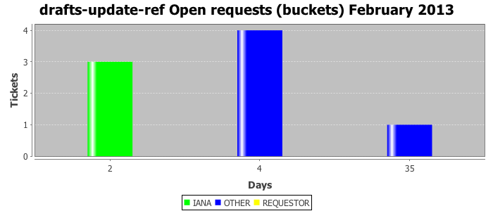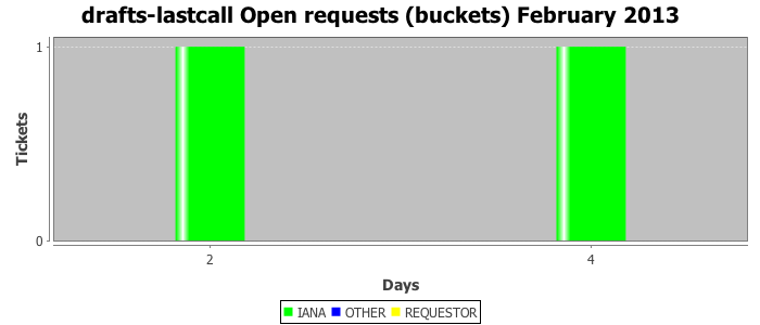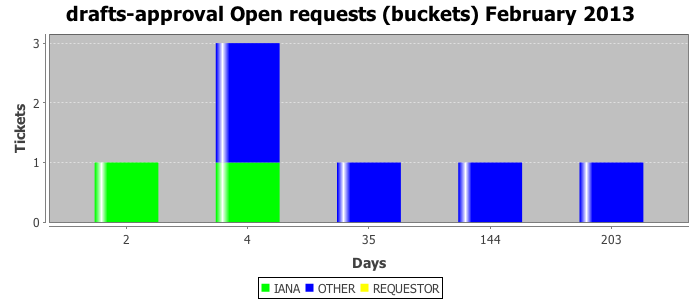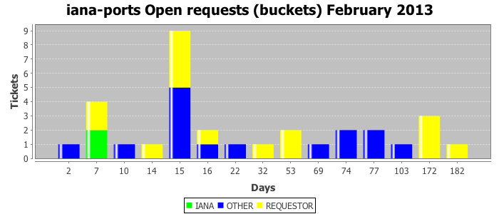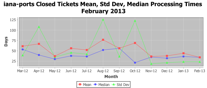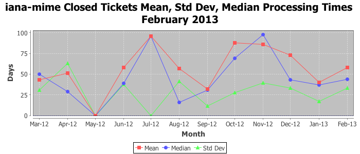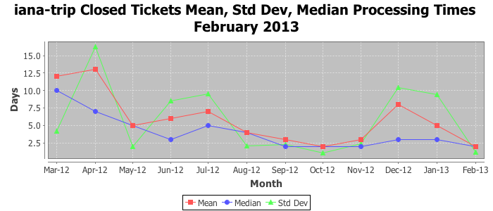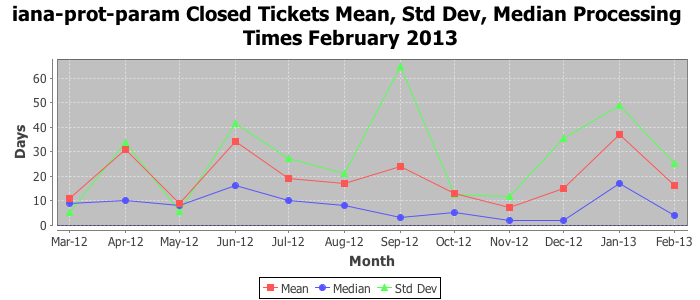 February 2013Due to the nature of resource request reviews, ICANN/IANA and the IETF community are jointly responsible for cooperatively managing the resource request process. ICANN/IANA has control over the functions it performs directly, e.g., receiving requests, making sure they are syntactically and semantically sensible, forwarding the requests to Designated Experts where appropriate, creating and modifying the registries, etc. The IETF community has direct or indirect control over functions performed by third parties, including IESG Designated Experts, the IESG, the IAB, the RFC Editor, and the requester. As such, the processing of requests has a “gross processing time” calendar days goal established for each function and a “net processing time” calendar days goal to reflect time expended directly by ICANN/IANA.