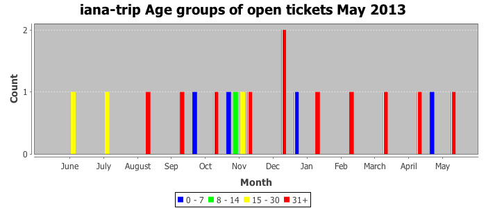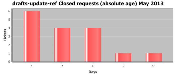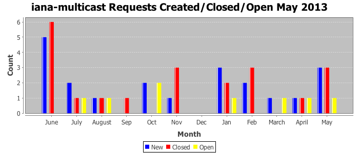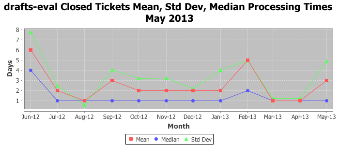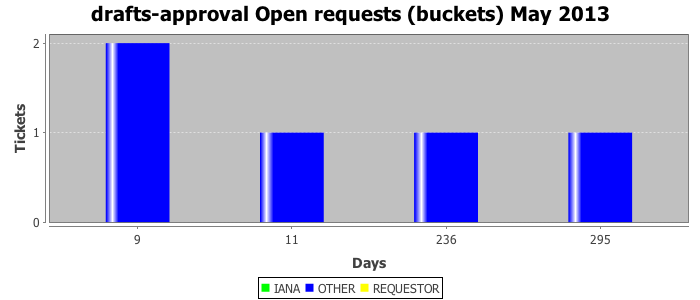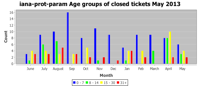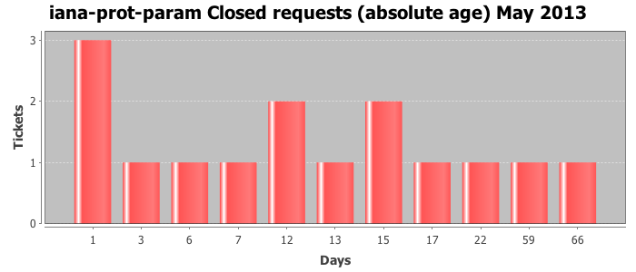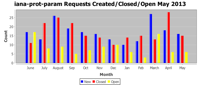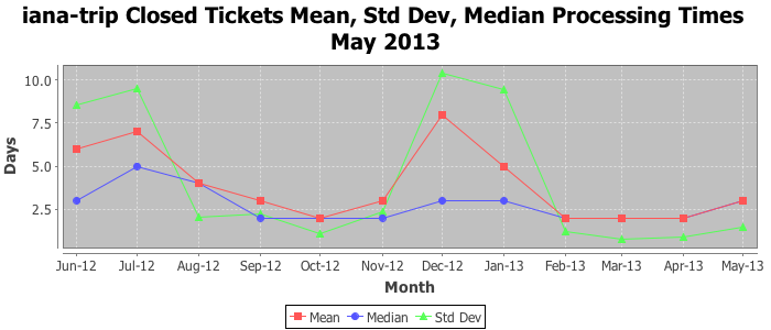 May 2013Due to the nature of resource request reviews, ICANN/IANA and the IETF community are jointly responsible for cooperatively managing the resource request process. ICANN/IANA has control over the functions it performs directly, e.g., receiving requests, making sure they are syntactically and semantically sensible, forwarding the requests to Designated Experts where appropriate, creating and modifying the registries, etc. The IETF community has direct or indirect control over functions performed by third parties, including IESG Designated Experts, the IESG, the IAB, the RFC Editor, and the requester. As such, the processing of requests has a “gross processing time” calendar days goal established for each function and a “net processing time” calendar days goal to reflect time expended directly by ICANN/IANA.