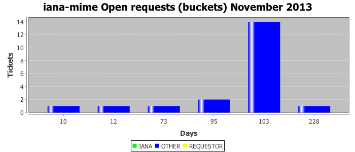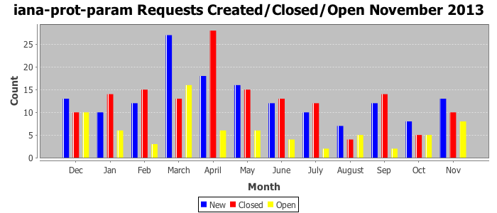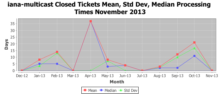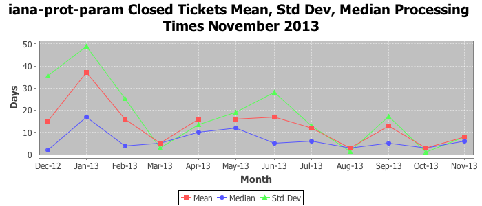 November 2013Due to the nature of resource request reviews, ICANN/IANA and the IETF community are jointly responsible for cooperatively managing the resource request process. ICANN/IANA has control over the functions it performs directly, e.g., receiving requests, making sure they are syntactically and semantically sensible, forwarding the requests to Designated Experts where appropriate, creating and modifying the registries, etc. The IETF community has direct or indirect control over functions performed by third parties, including IESG Designated Experts, the IESG, the IAB, the RFC Editor, and the requester. As such, the processing of requests has a “gross processing time” calendar days goal established for each function and a “net processing time” calendar days goal to reflect time expended directly by ICANN/IANA.