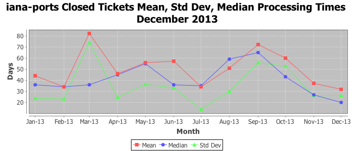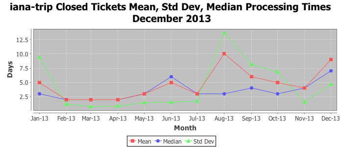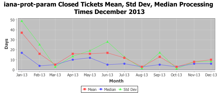 December 2013Due to the nature of resource request reviews, ICANN/IANA and the IETF community are jointly responsible for cooperatively managing the resource request process. ICANN/IANA has control over the functions it performs directly, e.g., receiving requests, making sure they are syntactically and semantically sensible, forwarding the requests to Designated Experts where appropriate, creating and modifying the registries, etc. The IETF community has direct or indirect control over functions performed by third parties, including IESG Designated Experts, the IESG, the IAB, the RFC Editor, and the requester. As such, the processing of requests has a “gross processing time” calendar days goal established for each function and a “net processing time” calendar days goal to reflect time expended directly by ICANN/IANA.