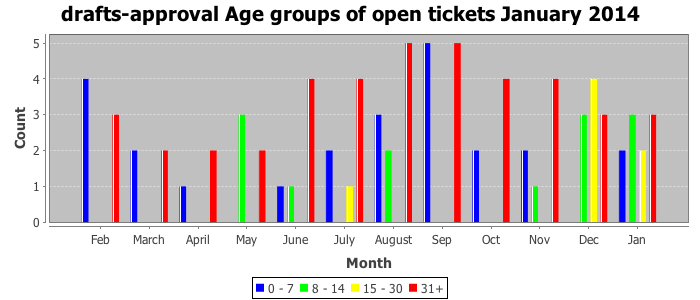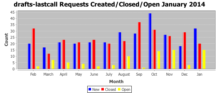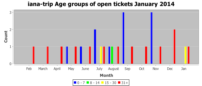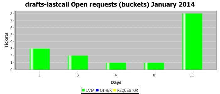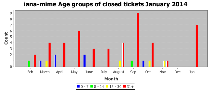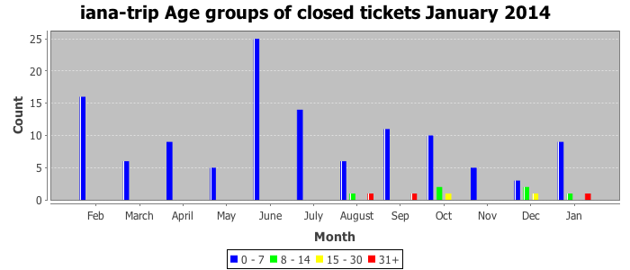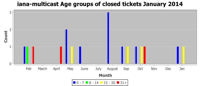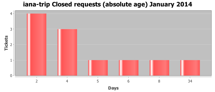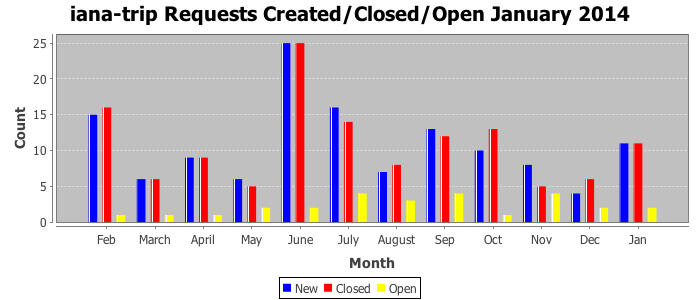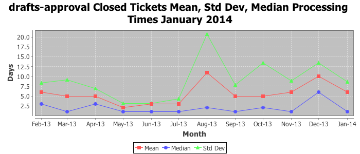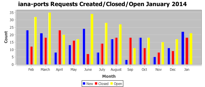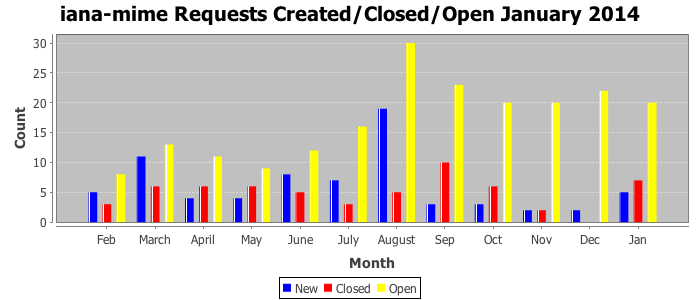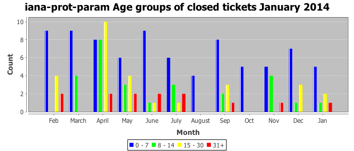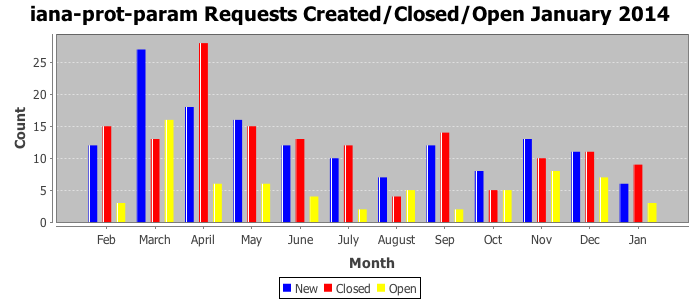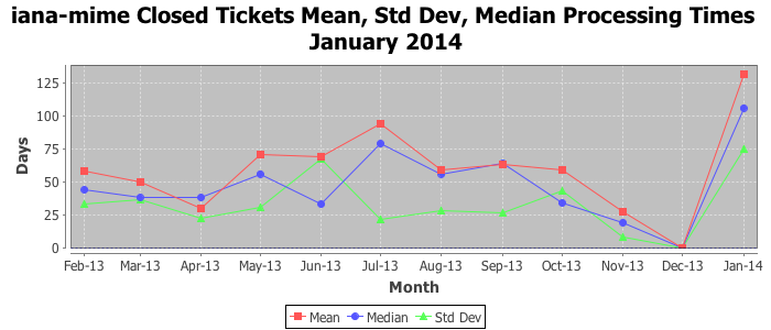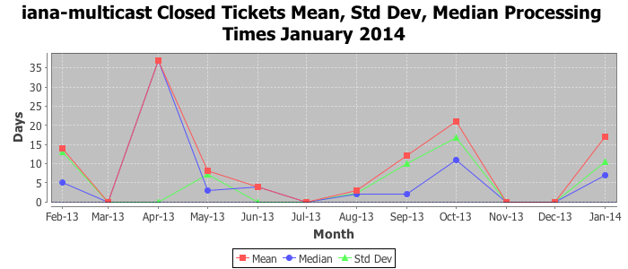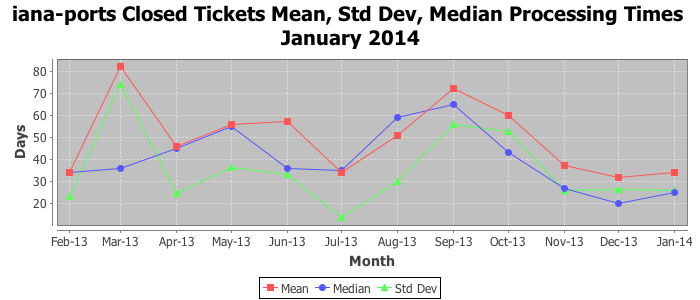 January 2014Due to the nature of resource request reviews, ICANN/IANA and the IETF community are jointly responsible for cooperatively managing the resource request process. ICANN/IANA has control over the functions it performs directly, e.g., receiving requests, making sure they are syntactically and semantically sensible, forwarding the requests to Designated Experts where appropriate, creating and modifying the registries, etc. The IETF community has direct or indirect control over functions performed by third parties, including IESG Designated Experts, the IESG, the IAB, the RFC Editor, and the requester. As such, the processing of requests has a “gross processing time” calendar days goal established for each function and a “net processing time” calendar days goal to reflect time expended directly by ICANN/IANA.