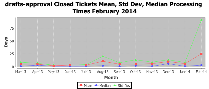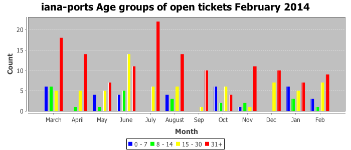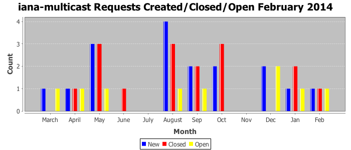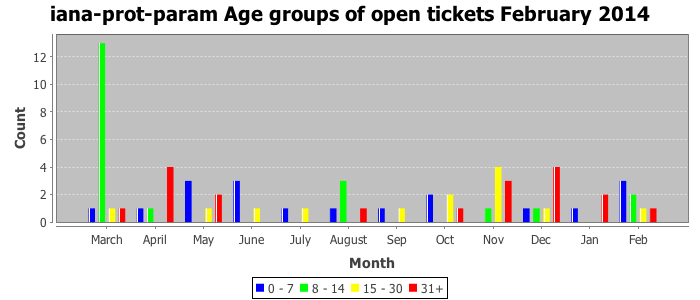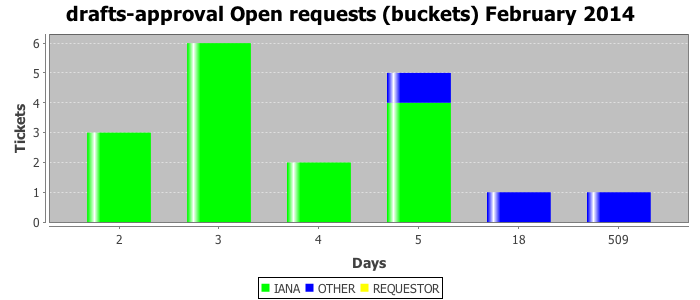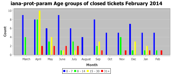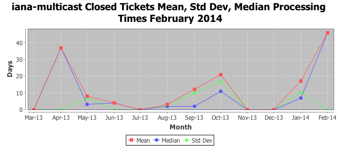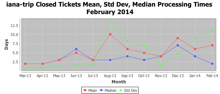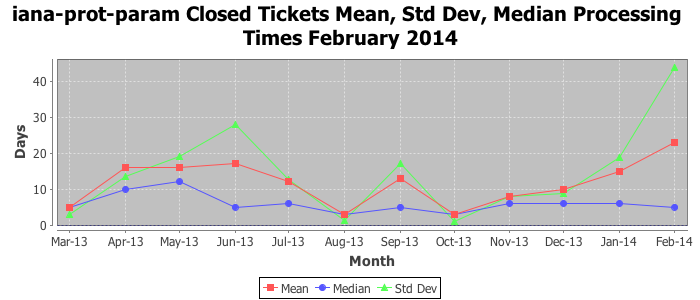 February 2014Due to the nature of resource request reviews, ICANN/IANA and the IETF community are jointly responsible for cooperatively managing the resource request process. ICANN/IANA has control over the functions it performs directly, e.g., receiving requests, making sure they are syntactically and semantically sensible, forwarding the requests to Designated Experts where appropriate, creating and modifying the registries, etc. The IETF community has direct or indirect control over functions performed by third parties, including IESG Designated Experts, the IESG, the IAB, the RFC Editor, and the requester. As such, the processing of requests has a “gross processing time” calendar days goal established for each function and a “net processing time” calendar days goal to reflect time expended directly by ICANN/IANA.