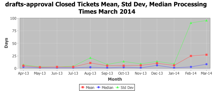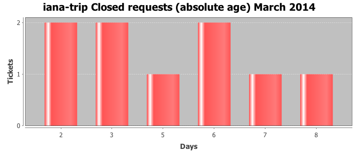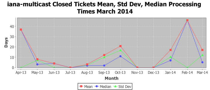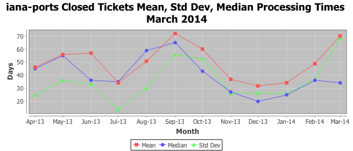 March 2014Due to the nature of resource request reviews, ICANN/IANA and the IETF community are jointly responsible for cooperatively managing the resource request process. ICANN/IANA has control over the functions it performs directly, e.g., receiving requests, making sure they are syntactically and semantically sensible, forwarding the requests to Designated Experts where appropriate, creating and modifying the registries, etc. The IETF community has direct or indirect control over functions performed by third parties, including IESG Designated Experts, the IESG, the IAB, the RFC Editor, and the requester. As such, the processing of requests has a “gross processing time” calendar days goal established for each function and a “net processing time” calendar days goal to reflect time expended directly by ICANN/IANA.