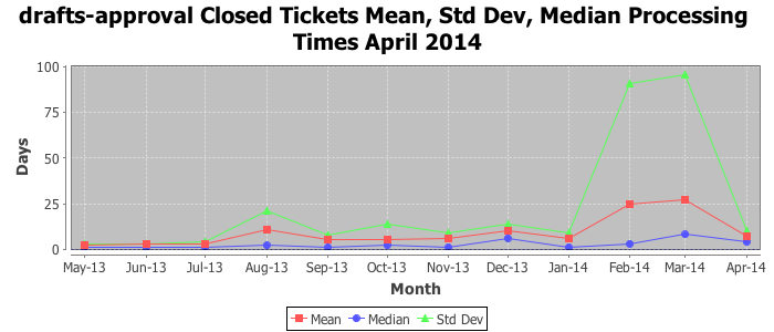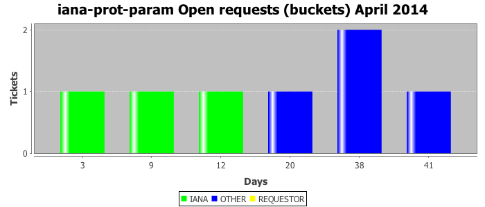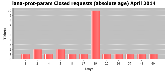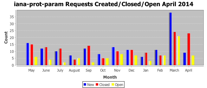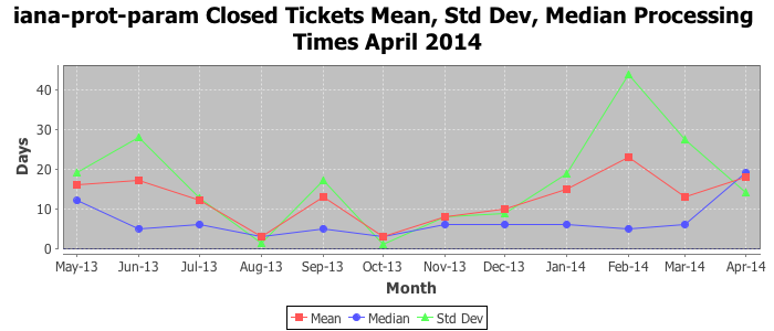 April 2014Due to the nature of resource request reviews, ICANN/IANA and the IETF community are jointly responsible for cooperatively managing the resource request process. ICANN/IANA has control over the functions it performs directly, e.g., receiving requests, making sure they are syntactically and semantically sensible, forwarding the requests to Designated Experts where appropriate, creating and modifying the registries, etc. The IETF community has direct or indirect control over functions performed by third parties, including IESG Designated Experts, the IESG, the IAB, the RFC Editor, and the requester. As such, the processing of requests has a “gross processing time” calendar days goal established for each function and a “net processing time” calendar days goal to reflect time expended directly by ICANN/IANA.