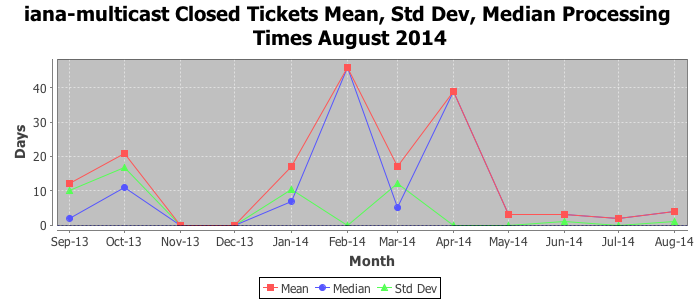 August 2014Due to the nature of resource request reviews, ICANN/IANA and the IETF community are jointly responsible for cooperatively managing the resource request process. ICANN/IANA has control over the functions it performs directly, e.g., receiving requests, making sure they are syntactically and semantically sensible, forwarding the requests to Designated Experts where appropriate, creating and modifying the registries, etc. The IETF community has direct or indirect control over functions performed by third parties, including IESG Designated Experts, the IESG, the IAB, the RFC Editor, and the requester. As such, the processing of requests has a “gross processing time” calendar days goal established for each function and a “net processing time” calendar days goal to reflect time expended directly by ICANN/IANA.