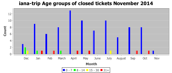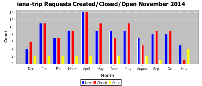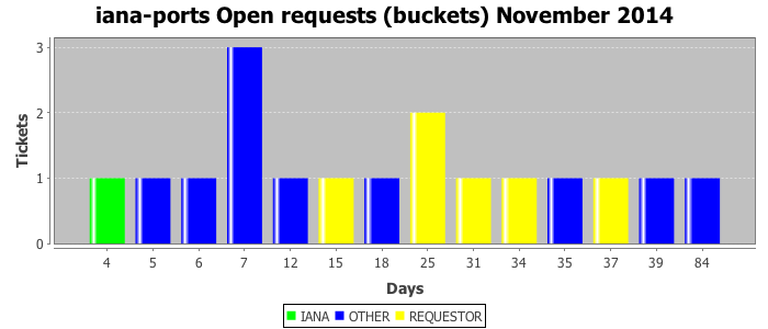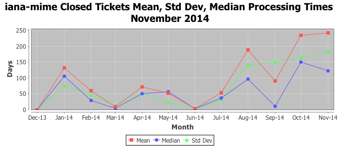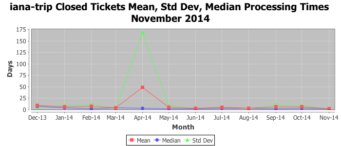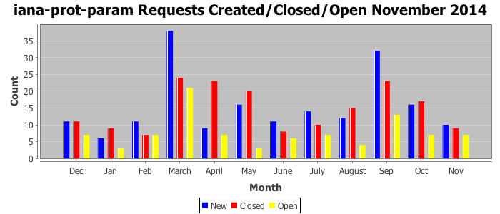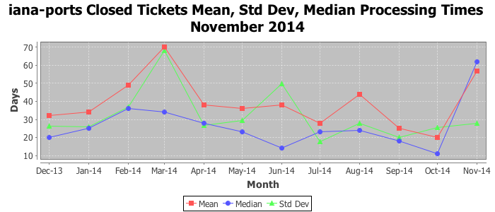 November 2014Due to the nature of resource request reviews, ICANN/IANA and the IETF community are jointly responsible for cooperatively managing the resource request process. ICANN/IANA has control over the functions it performs directly, e.g., receiving requests, making sure they are syntactically and semantically sensible, forwarding the requests to Designated Experts where appropriate, creating and modifying the registries, etc. The IETF community has direct or indirect control over functions performed by third parties, including IESG Designated Experts, the IESG, the IAB, the RFC Editor, and the requester. As such, the processing of requests has a “gross processing time” calendar days goal established for each function and a “net processing time” calendar days goal to reflect time expended directly by ICANN/IANA.