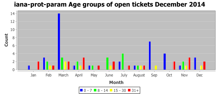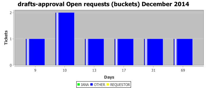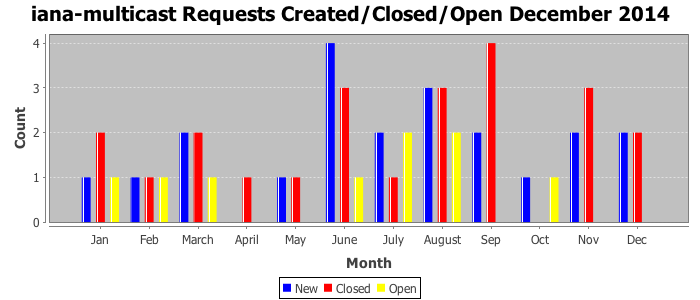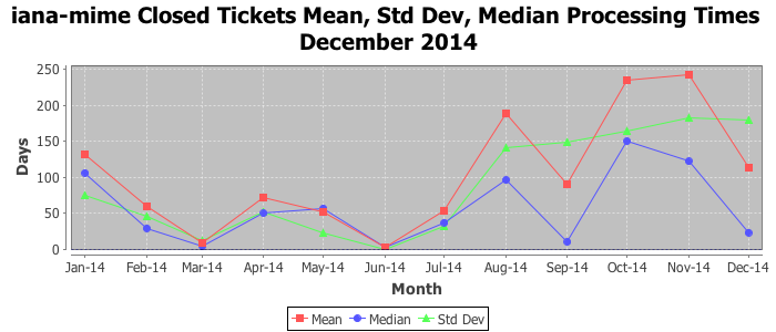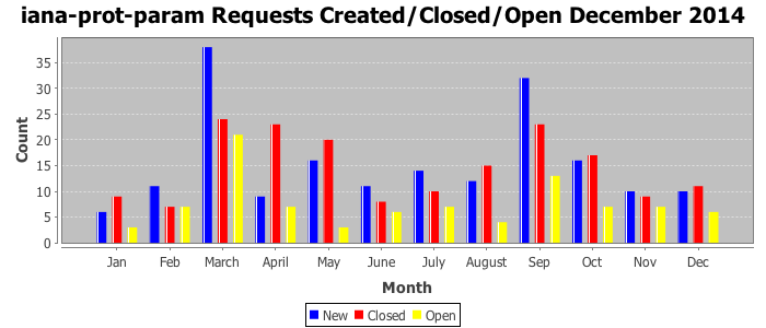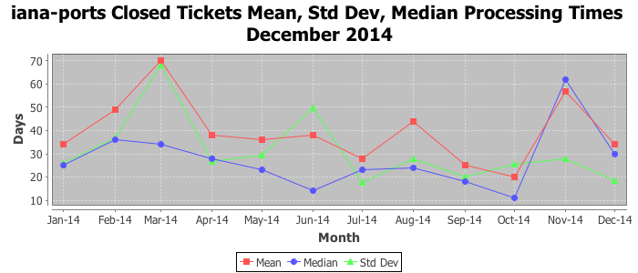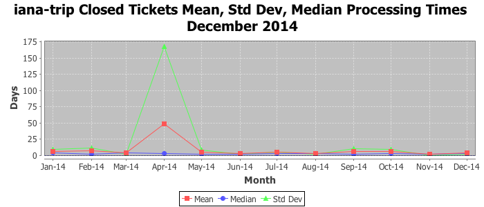 December 2014Due to the nature of resource request reviews, ICANN/IANA and the IETF community are jointly responsible for cooperatively managing the resource request process. ICANN/IANA has control over the functions it performs directly, e.g., receiving requests, making sure they are syntactically and semantically sensible, forwarding the requests to Designated Experts where appropriate, creating and modifying the registries, etc. The IETF community has direct or indirect control over functions performed by third parties, including IESG Designated Experts, the IESG, the IAB, the RFC Editor, and the requester. As such, the processing of requests has a “gross processing time” calendar days goal established for each function and a “net processing time” calendar days goal to reflect time expended directly by ICANN/IANA.
