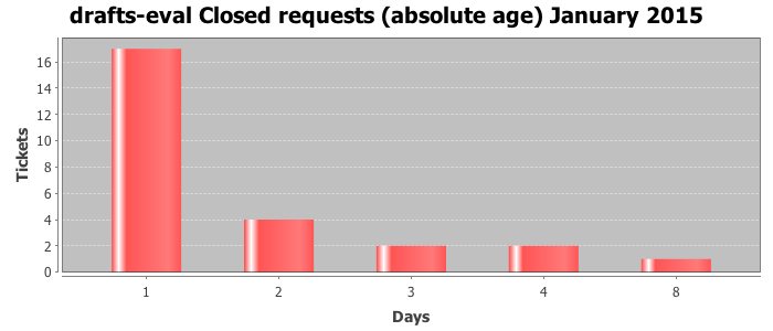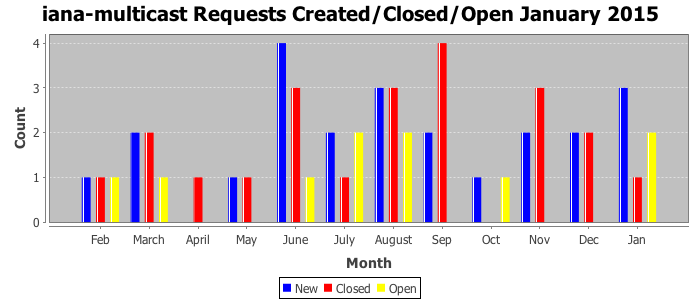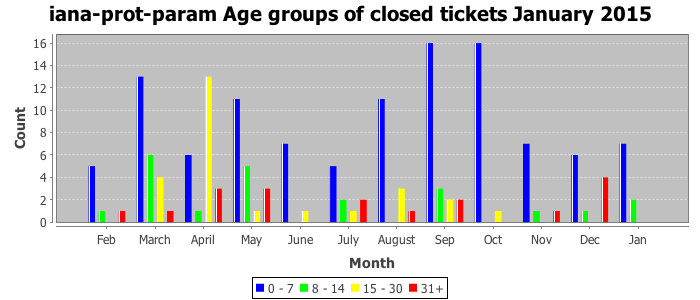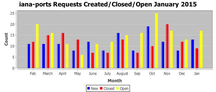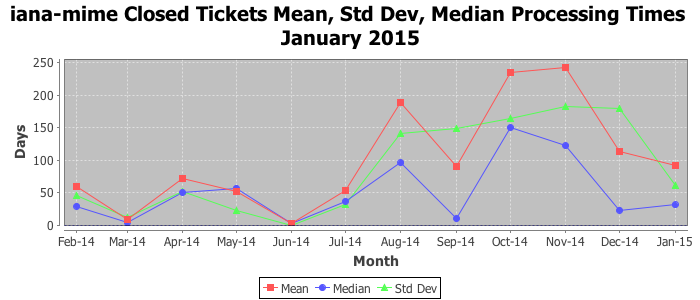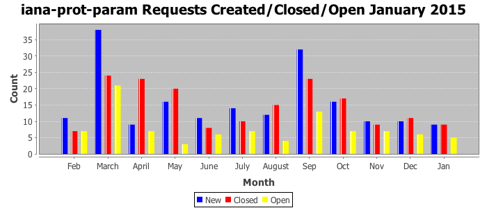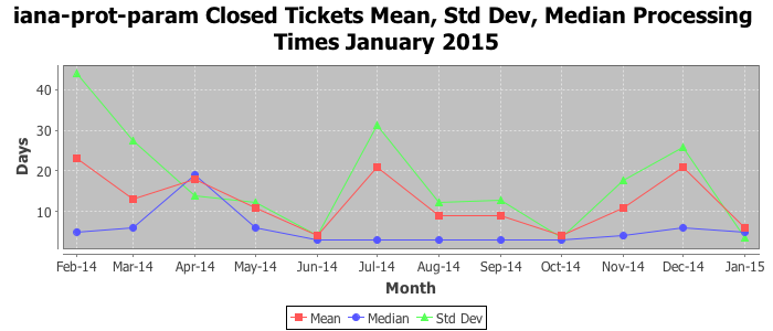 January 2015Due to the nature of resource request reviews, ICANN/IANA and the IETF community are jointly responsible for cooperatively managing the resource request process. ICANN/IANA has control over the functions it performs directly, e.g., receiving requests, making sure they are syntactically and semantically sensible, forwarding the requests to Designated Experts where appropriate, creating and modifying the registries, etc. The IETF community has direct or indirect control over functions performed by third parties, including IESG Designated Experts, the IESG, the IAB, the RFC Editor, and the requester. As such, the processing of requests has a “gross processing time” calendar days goal established for each function and a “net processing time” calendar days goal to reflect time expended directly by ICANN/IANA.