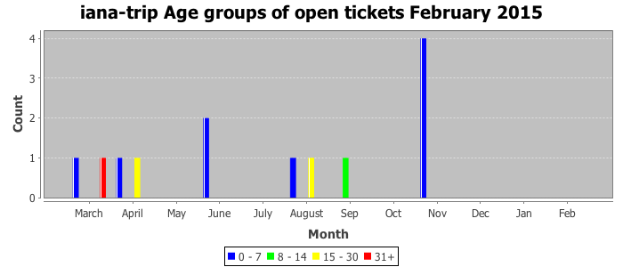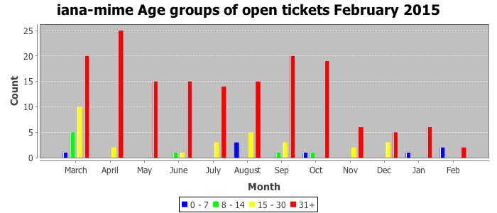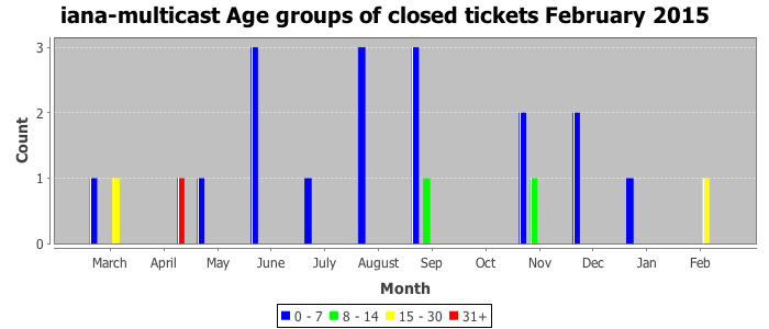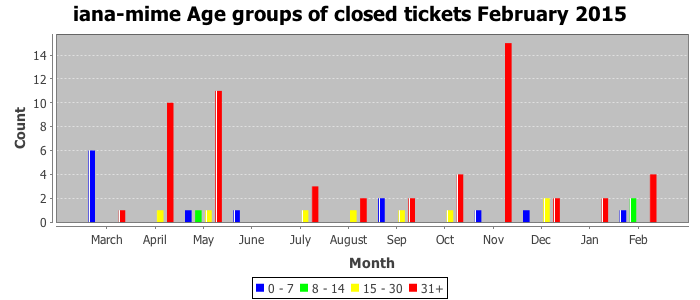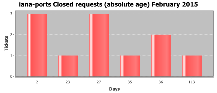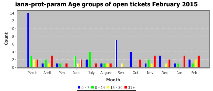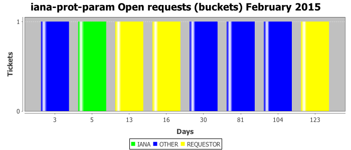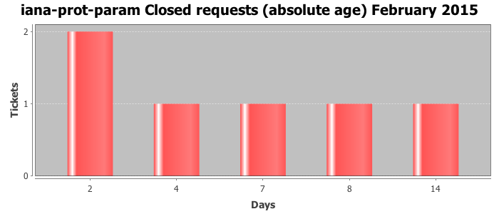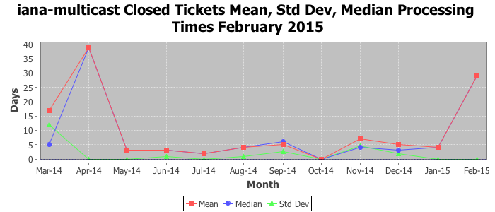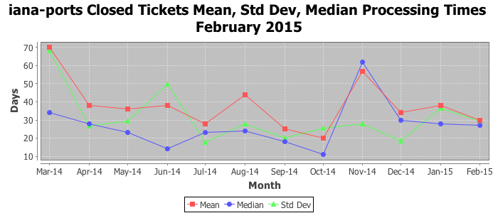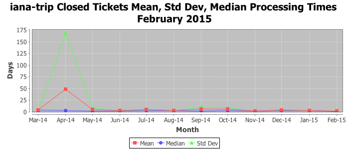 February 2015Due to the nature of resource request reviews, ICANN/IANA and the IETF community are jointly responsible for cooperatively managing the resource request process. ICANN/IANA has control over the functions it performs directly, e.g., receiving requests, making sure they are syntactically and semantically sensible, forwarding the requests to Designated Experts where appropriate, creating and modifying the registries, etc. The IETF community has direct or indirect control over functions performed by third parties, including IESG Designated Experts, the IESG, the IAB, the RFC Editor, and the requester. As such, the processing of requests has a “gross processing time” calendar days goal established for each function and a “net processing time” calendar days goal to reflect time expended directly by ICANN/IANA.