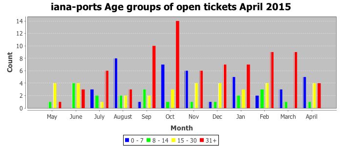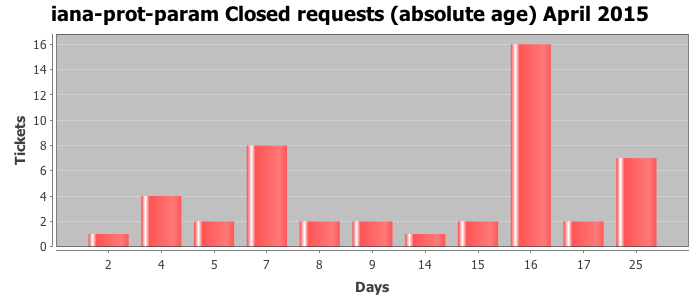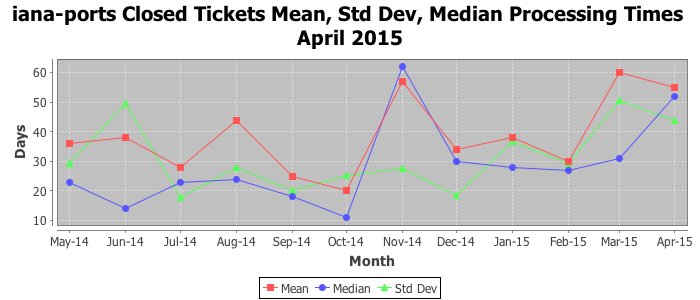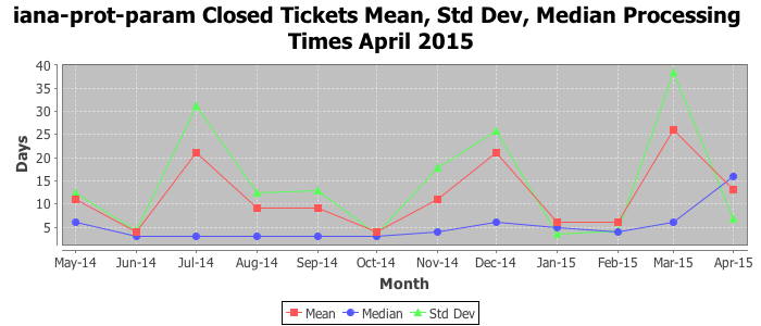 April 2015Due to the nature of resource request reviews, ICANN/IANA and the IETF community are jointly responsible for cooperatively managing the resource request process. ICANN/IANA has control over the functions it performs directly, e.g., receiving requests, making sure they are syntactically and semantically sensible, forwarding the requests to Designated Experts where appropriate, creating and modifying the registries, etc. The IETF community has direct or indirect control over functions performed by third parties, including IESG Designated Experts, the IESG, the IAB, the RFC Editor, and the requester. As such, the processing of requests has a “gross processing time” calendar days goal established for each function and a “net processing time” calendar days goal to reflect time expended directly by ICANN/IANA.