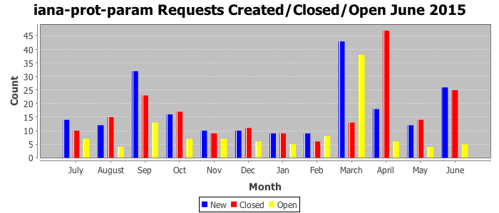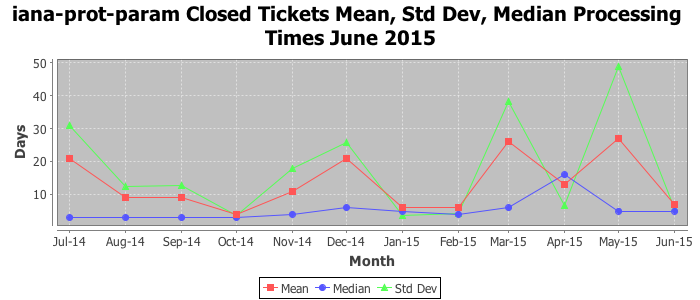 June 2015Due to the nature of resource request reviews, ICANN/IANA and the IETF community are jointly responsible for cooperatively managing the resource request process. ICANN/IANA has control over the functions it performs directly, e.g., receiving requests, making sure they are syntactically and semantically sensible, forwarding the requests to Designated Experts where appropriate, creating and modifying the registries, etc. The IETF community has direct or indirect control over functions performed by third parties, including IESG Designated Experts, the IESG, the IAB, the RFC Editor, and the requester. As such, the processing of requests has a “gross processing time” calendar days goal established for each function and a “net processing time” calendar days goal to reflect time expended directly by ICANN/IANA.