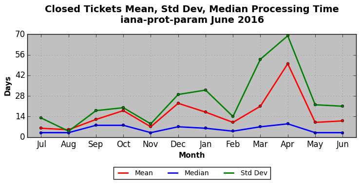 June 2016Due to the nature of resource request reviews, ICANN/IANA and the IETF community are jointly responsible for cooperatively managing the resource request process. ICANN/IANA has control over the functions it performs directly, e.g., receiving requests, making sure they are syntactically and semantically sensible, forwarding the requests to Designated Experts where appropriate, creating and modifying the registries, etc. The IETF community has direct or indirect control over functions performed by third parties, including IESG Designated Experts, the IESG, the IAB, the RFC Editor, and the requester. As such, the processing of requests has a “gross processing time” calendar days goal established for each function and a “net processing time” calendar days goal to reflect time expended directly by ICANN/IANA.