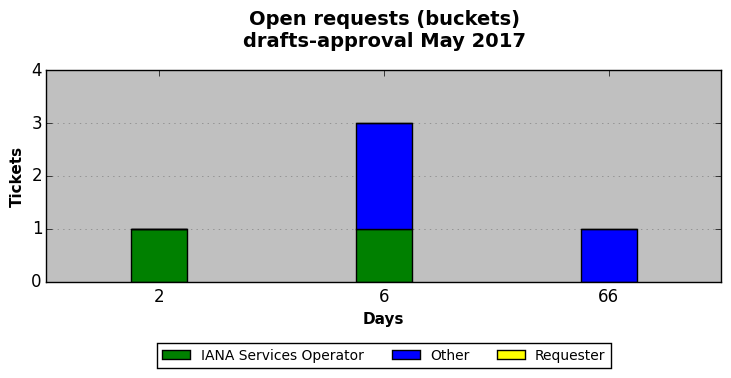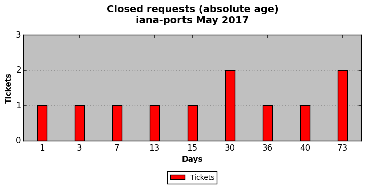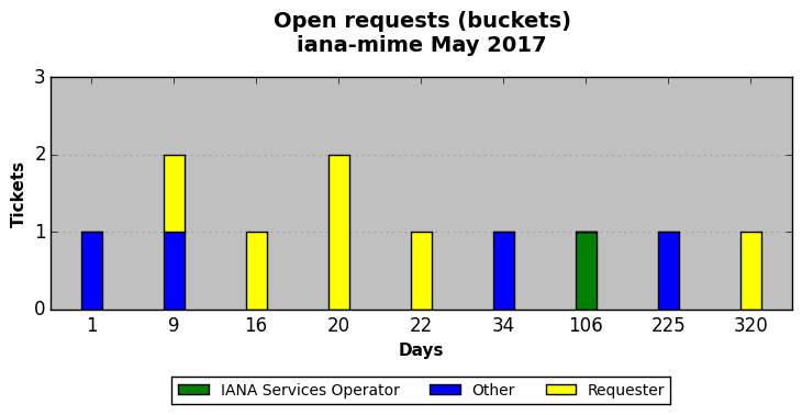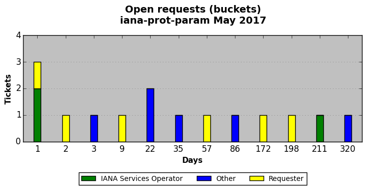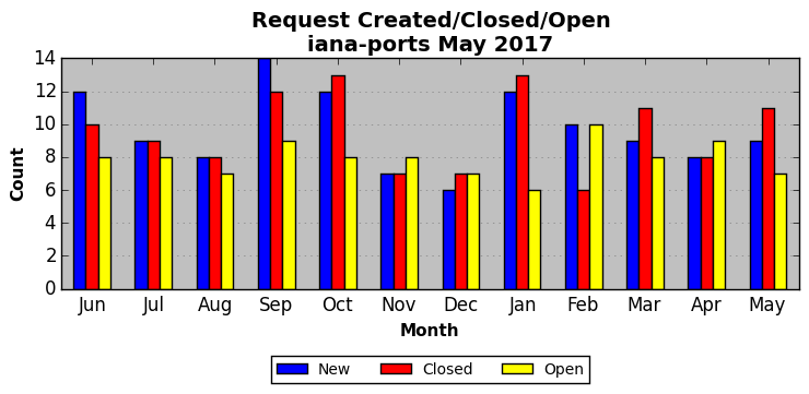 May 2017Due to the nature of resource request reviews, ICANN/IANA and the IETF community are jointly responsible for cooperatively managing the resource request process. ICANN/IANA has control over the functions it performs directly, e.g., receiving requests, making sure they are syntactically and semantically sensible, forwarding the requests to Designated Experts where appropriate, creating and modifying the registries, etc. The IETF community has direct or indirect control over functions performed by third parties, including IESG Designated Experts, the IESG, the IAB, the RFC Editor, and the requester. As such, the processing of requests has a “gross processing time” calendar days goal established for each function and a “net processing time” calendar days goal to reflect time expended directly by ICANN/IANA.