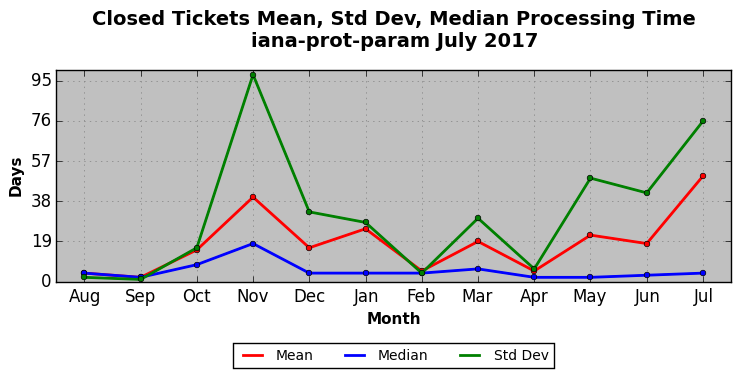 July 2017Due to the nature of resource request reviews, ICANN/IANA and the IETF community are jointly responsible for cooperatively managing the resource request process. ICANN/IANA has control over the functions it performs directly, e.g., receiving requests, making sure they are syntactically and semantically sensible, forwarding the requests to Designated Experts where appropriate, creating and modifying the registries, etc. The IETF community has direct or indirect control over functions performed by third parties, including IESG Designated Experts, the IESG, the IAB, the RFC Editor, and the requester. As such, the processing of requests has a “gross processing time” calendar days goal established for each function and a “net processing time” calendar days goal to reflect time expended directly by ICANN/IANA.