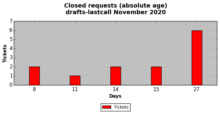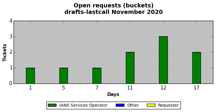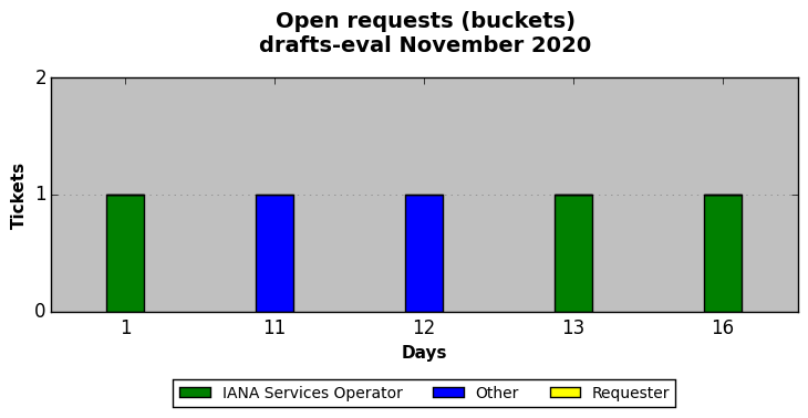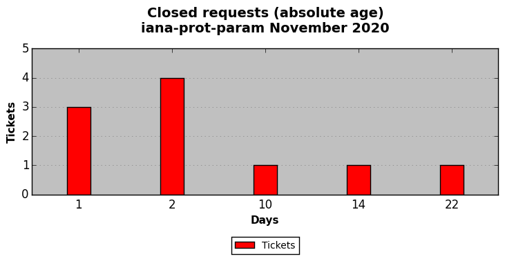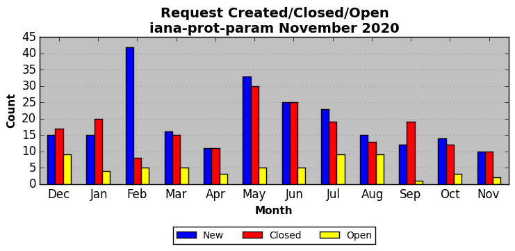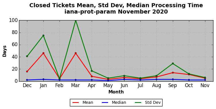 November 2020Due to the nature of resource request reviews, ICANN/IANA and the IETF community are jointly responsible for cooperatively managing the resource request process. ICANN/IANA has control over the functions it performs directly, e.g., receiving requests, making sure they are syntactically and semantically sensible, forwarding the requests to Designated Experts where appropriate, creating and modifying the registries, etc. The IETF community has direct or indirect control over functions performed by third parties, including IESG Designated Experts, the IESG, the IAB, the RFC Editor, and the requester. As such, the processing of requests has a “gross processing time” calendar days goal established for each function and a “net processing time” calendar days goal to reflect time expended directly by ICANN/IANA.