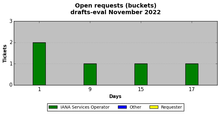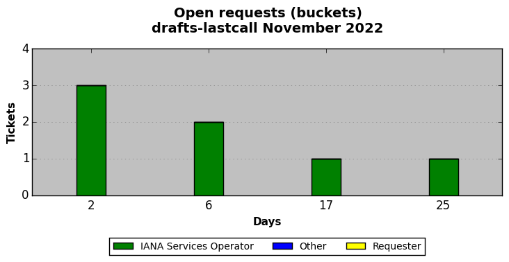 November 2022Due to the nature of resource request reviews, ICANN/IANA and the IETF community are jointly responsible for cooperatively managing the resource request process. ICANN/IANA has control over the functions it performs directly, e.g., receiving requests, making sure they are syntactically and semantically sensible, forwarding the requests to Designated Experts where appropriate, creating and modifying the registries, etc. The IETF community has direct or indirect control over functions performed by third parties, including IESG Designated Experts, the IESG, the IAB, the RFC Editor, and the requester. As such, the processing of requests has a “gross processing time” calendar days goal established for each function and a “net processing time” calendar days goal to reflect time expended directly by ICANN/IANA.