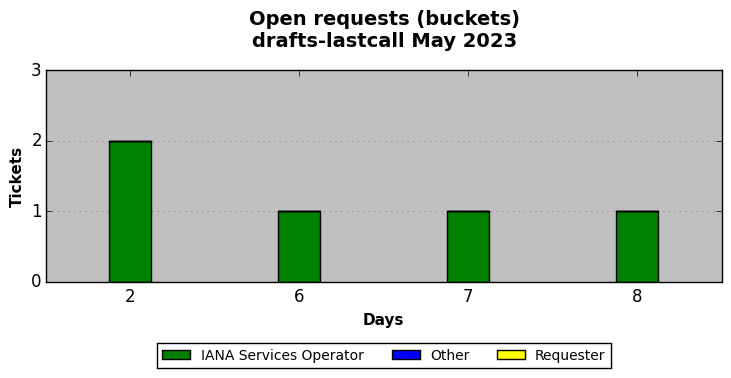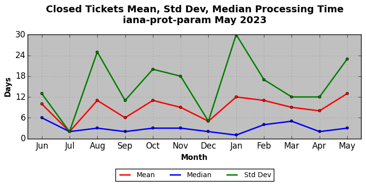 May 2023Due to the nature of resource request reviews, ICANN/IANA and the IETF community are jointly responsible for cooperatively managing the resource request process. ICANN/IANA has control over the functions it performs directly, e.g., receiving requests, making sure they are syntactically and semantically sensible, forwarding the requests to Designated Experts where appropriate, creating and modifying the registries, etc. The IETF community has direct or indirect control over functions performed by third parties, including IESG Designated Experts, the IESG, the IAB, the RFC Editor, and the requester. As such, the processing of requests has a “gross processing time” calendar days goal established for each function and a “net processing time” calendar days goal to reflect time expended directly by ICANN/IANA.