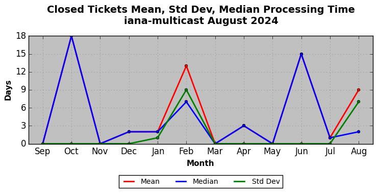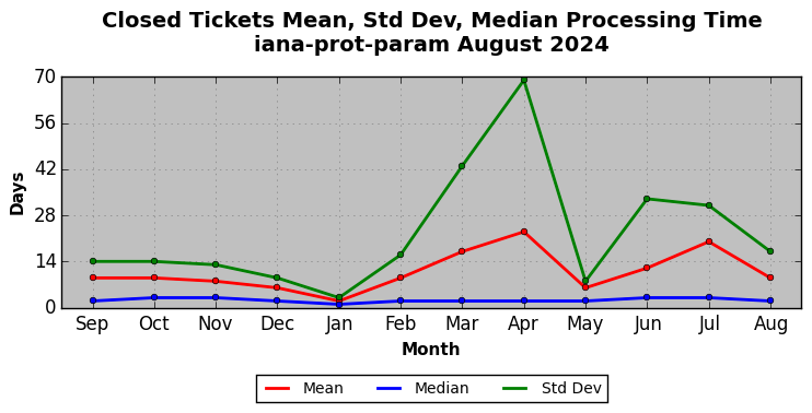 August 2024Due to the nature of resource request reviews, ICANN/IANA and the IETF community are jointly responsible for cooperatively managing the resource request process. ICANN/IANA has control over the functions it performs directly, e.g., receiving requests, making sure they are syntactically and semantically sensible, forwarding the requests to Designated Experts where appropriate, creating and modifying the registries, etc. The IETF community has direct or indirect control over functions performed by third parties, including IESG Designated Experts, the IESG, the IAB, the RFC Editor, and the requester. As such, the processing of requests has a “gross processing time” calendar days goal established for each function and a “net processing time” calendar days goal to reflect time expended directly by ICANN/IANA.
