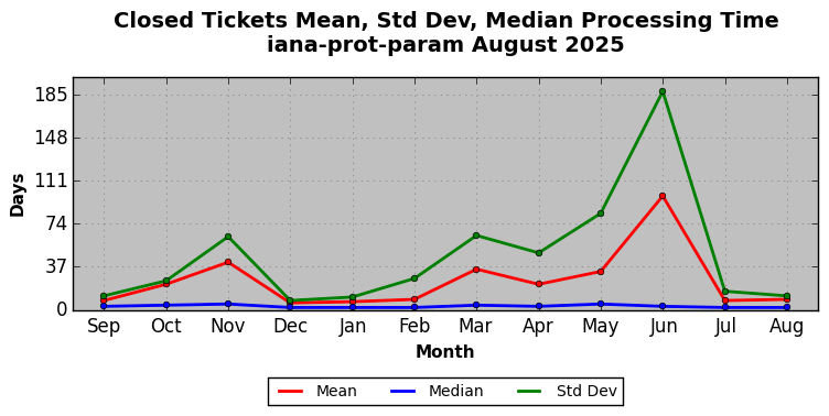 August 2025Due to the nature of resource request reviews, ICANN/IANA and the IETF community are jointly responsible for cooperatively managing the resource request process. ICANN/IANA has control over the functions it performs directly, e.g., receiving requests, making sure they are syntactically and semantically sensible, forwarding the requests to Designated Experts where appropriate, creating and modifying the registries, etc. The IETF community has direct or indirect control over functions performed by third parties, including IESG Designated Experts, the IESG, the IAB, the RFC Editor, and the requester. As such, the processing of requests has a “gross processing time” calendar days goal established for each function and a “net processing time” calendar days goal to reflect time expended directly by ICANN/IANA.