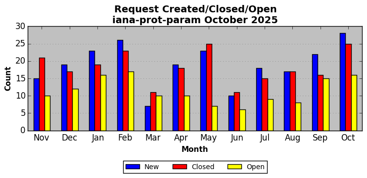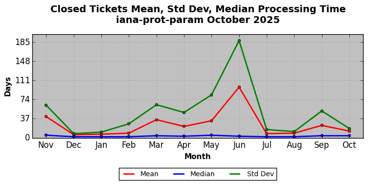 October 2025Due to the nature of resource request reviews, ICANN/IANA and the IETF community are jointly responsible for cooperatively managing the resource request process. ICANN/IANA has control over the functions it performs directly, e.g., receiving requests, making sure they are syntactically and semantically sensible, forwarding the requests to Designated Experts where appropriate, creating and modifying the registries, etc. The IETF community has direct or indirect control over functions performed by third parties, including IESG Designated Experts, the IESG, the IAB, the RFC Editor, and the requester. As such, the processing of requests has a “gross processing time” calendar days goal established for each function and a “net processing time” calendar days goal to reflect time expended directly by ICANN/IANA.