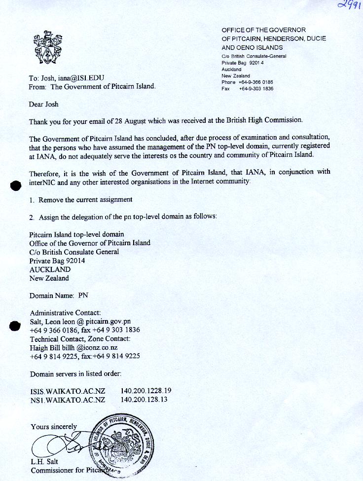 Shortly after the initial delegation was made, on September 8, 1997 Leon Salt, Commissioner for Pitcairn Island, wrote to the IANA stating that: