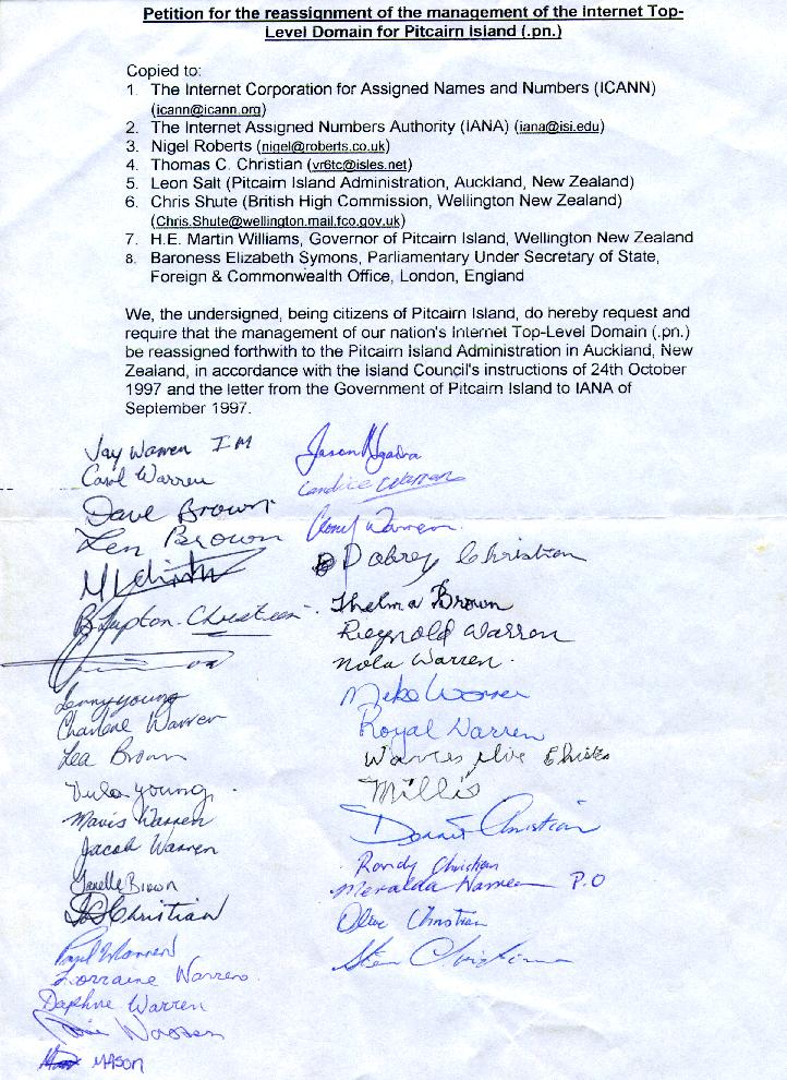 We, the undersigned, being residents of Pitcairn Island, do hereby request and require that the management of our nation's Internet Top-Level Domain (.pn.) be reassigned forthwith to the Pitcairn Island Administration in Auckland, New Zealand, in accordance with the Island Council's instructions of 24th October 1997 and the letter from the Government of Pitcairn Island to IANA of September 1997.